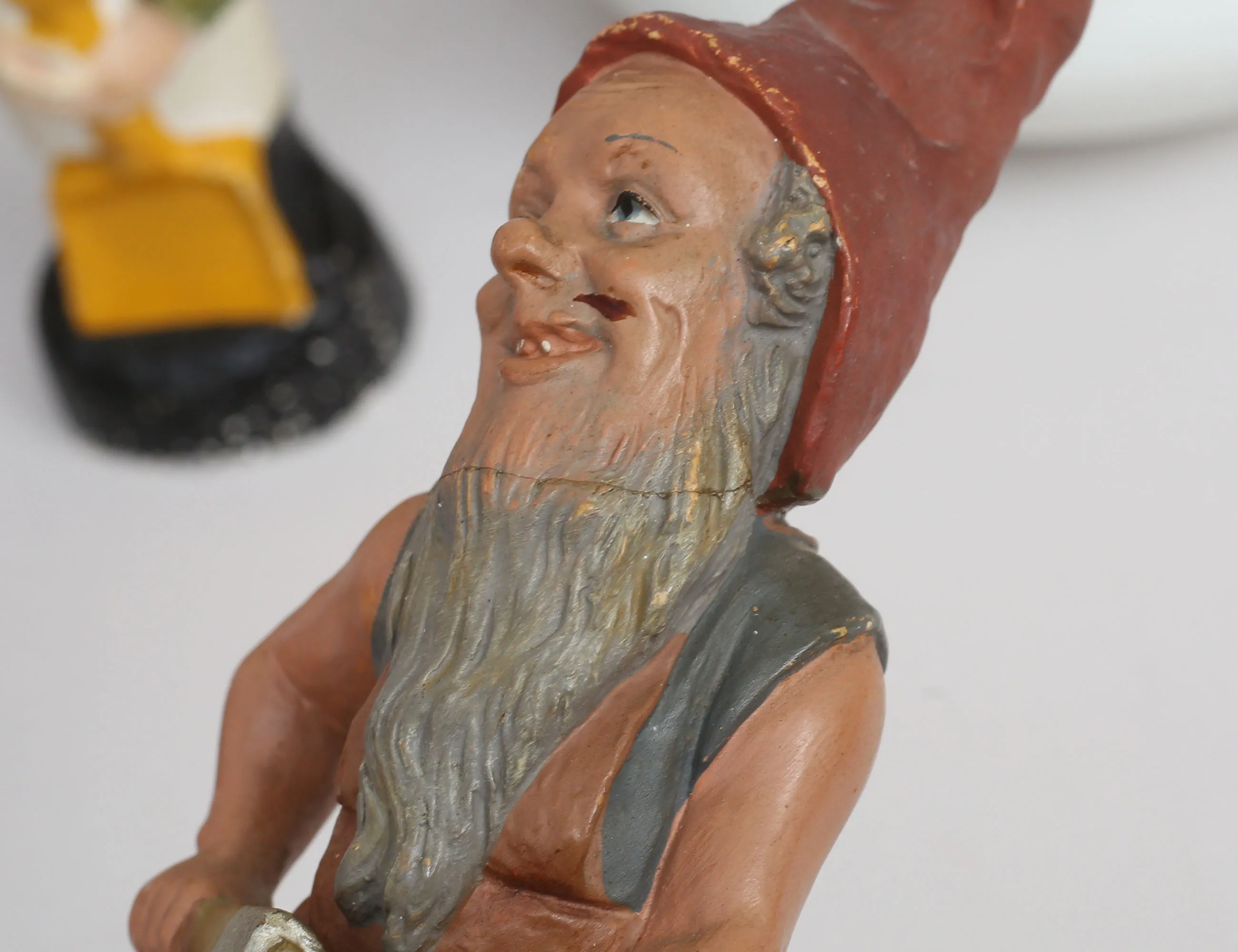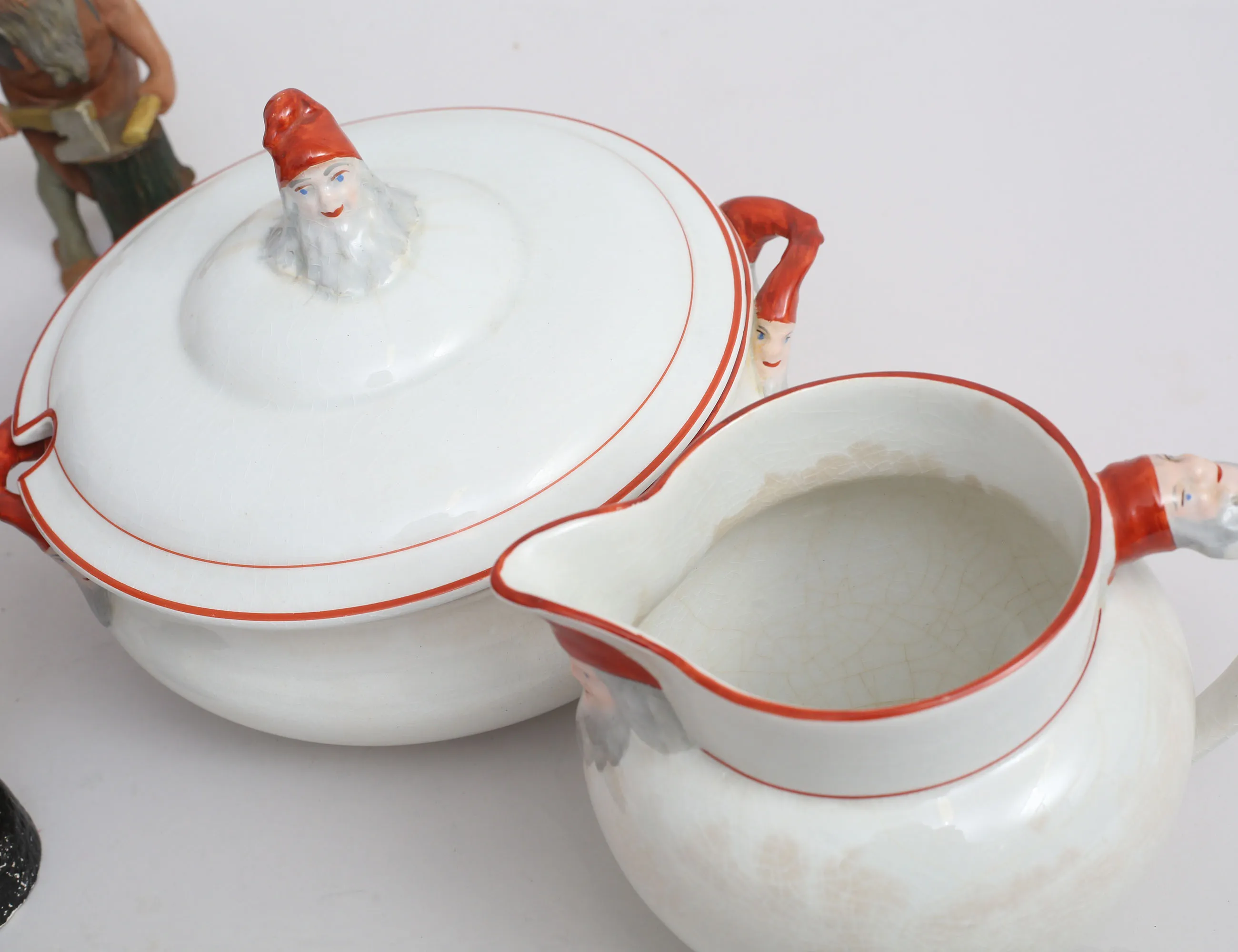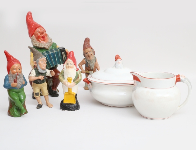 grötskål och tillbringare Rörstrand tidigt 1900-tal (missfärgning), 5 tomtar 1900-tal, keramik/gips, höjd 17-30 (en saknar hand och lagad fot, en med lagat huvud)
