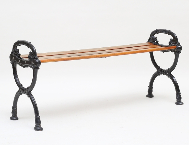 så kallad stations soffa, gavlar i svartlackerad aluminium, träribbor i oljad mahogny, höjd 54, bredd 111, djup 38 (smärre bruksslitage)