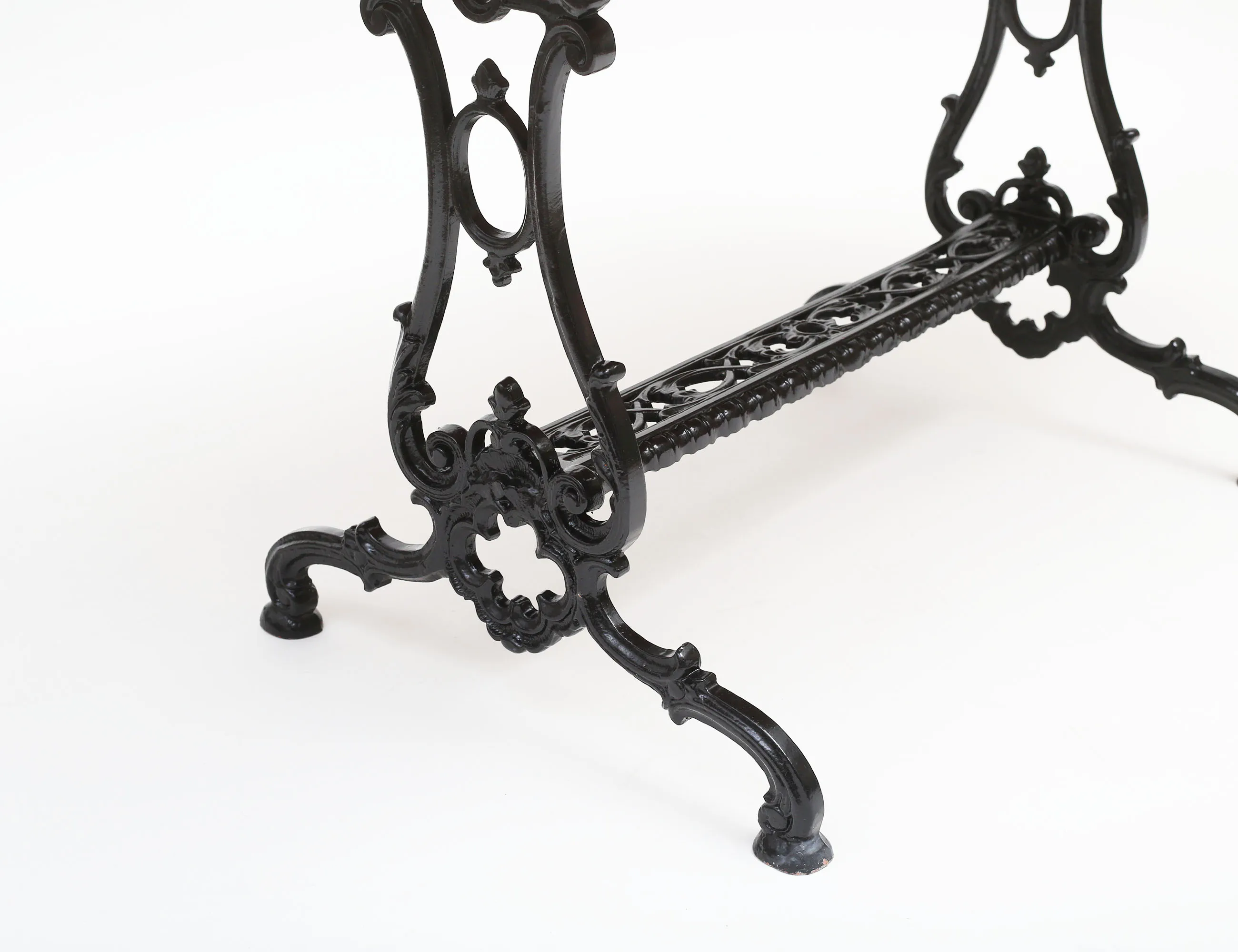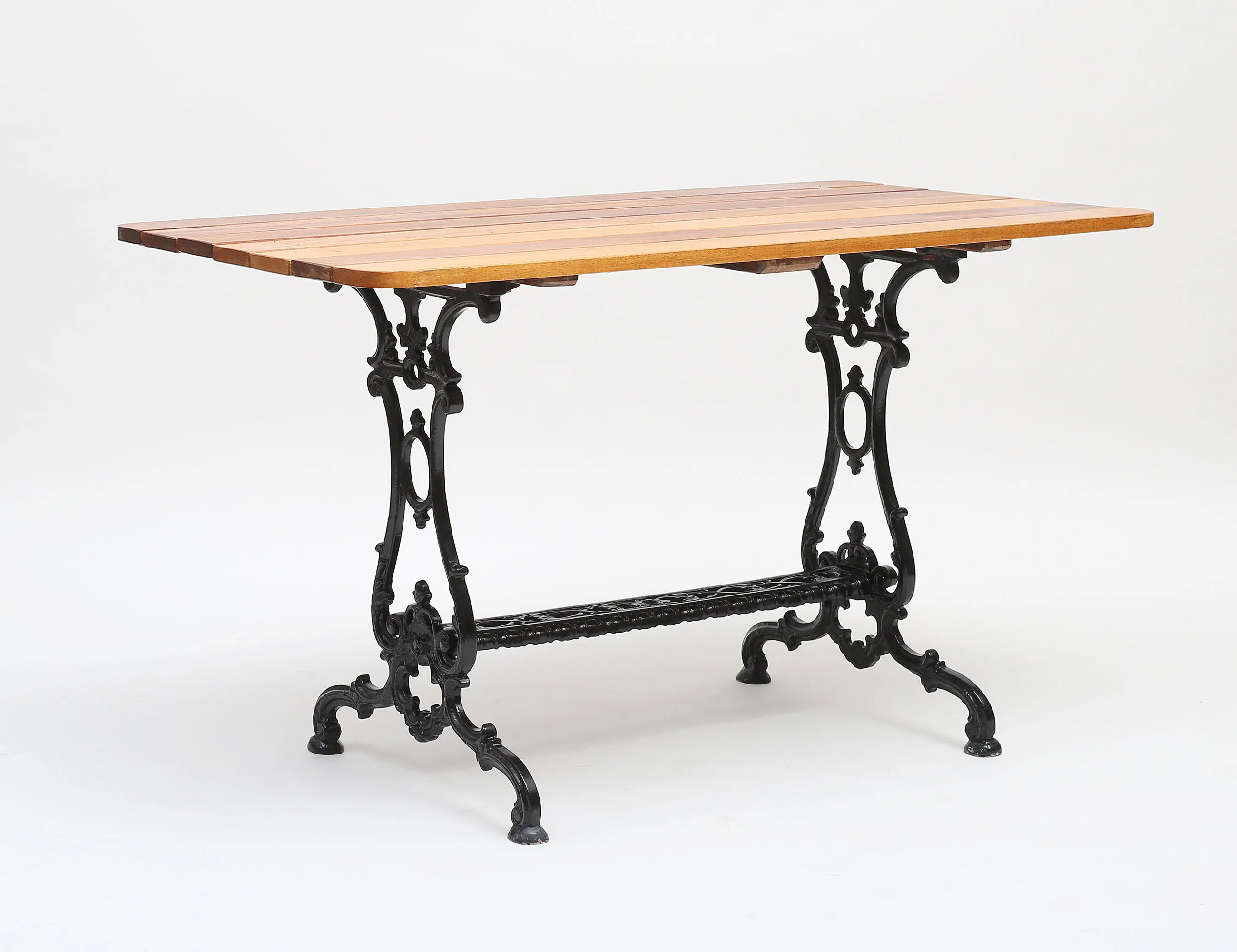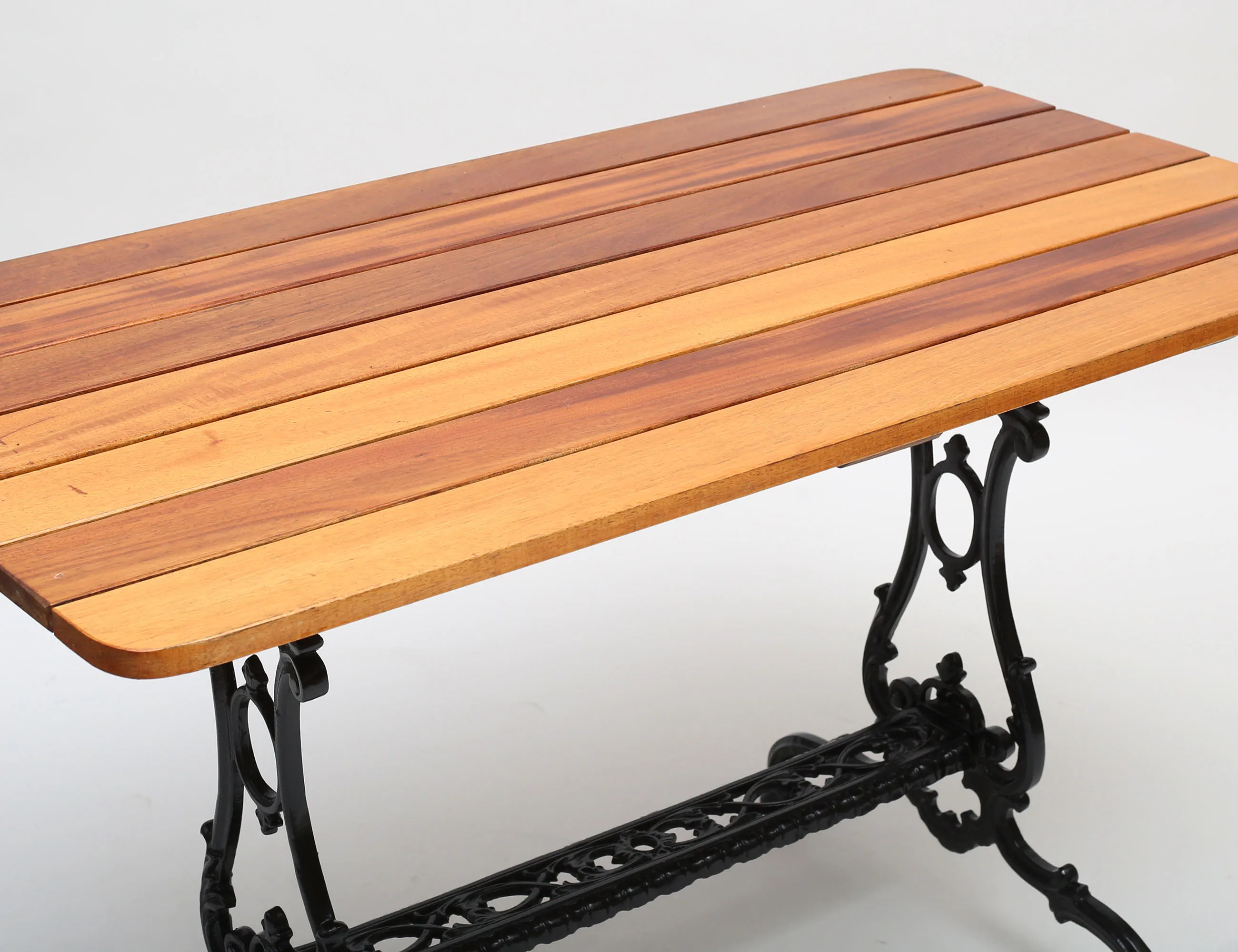 underrede i rikt genombrutet gjutgods, träribbor i oljad mahogny, höjd 74, bredd 125x70