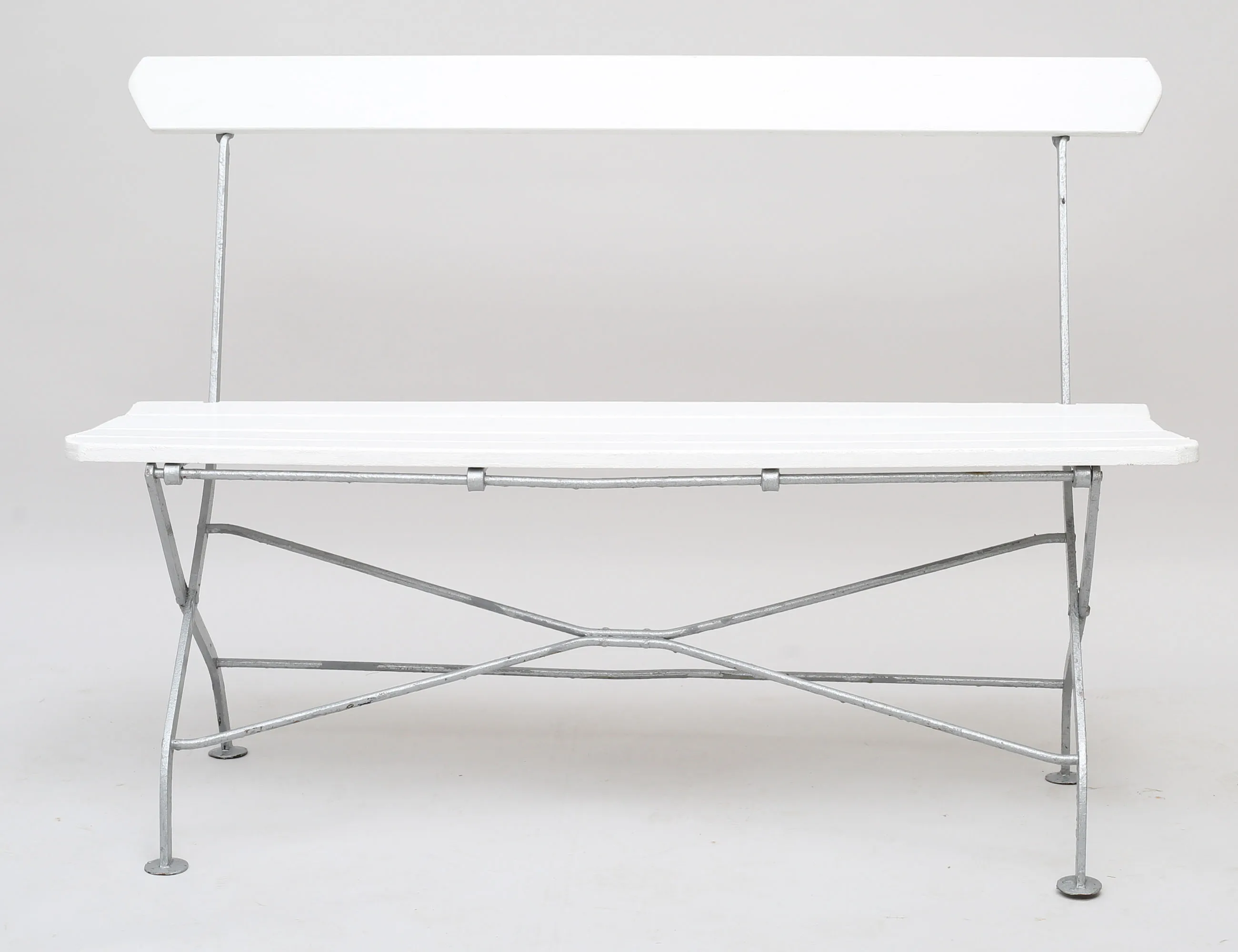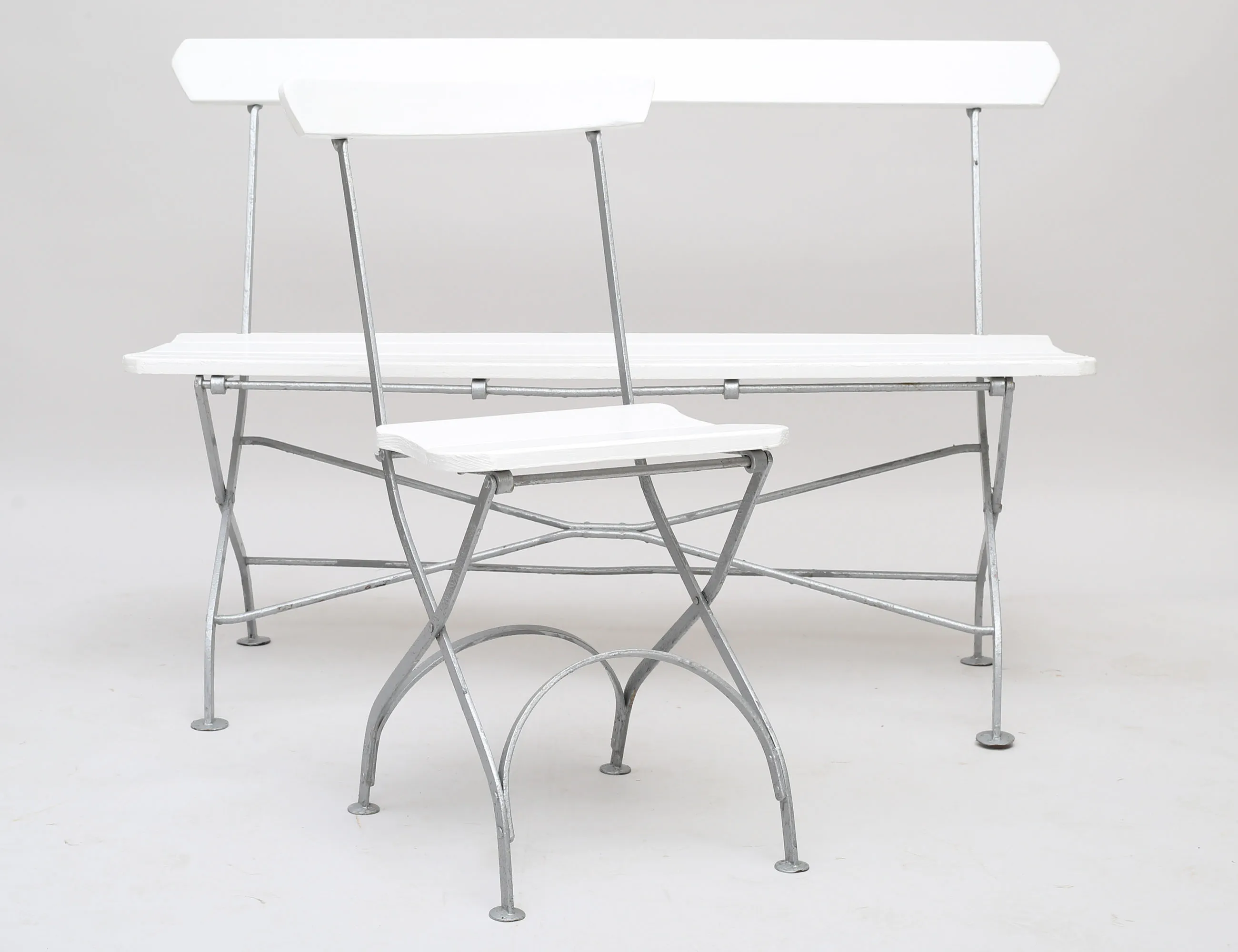 bryggerimodell 1900-talets mitt, soffa, 1 par stolar samt bord, vitmålade träribbor, stativ i silverfärgad metall, hopfällbara, höjd 87, bredd 127 (smärre bruksslitage)