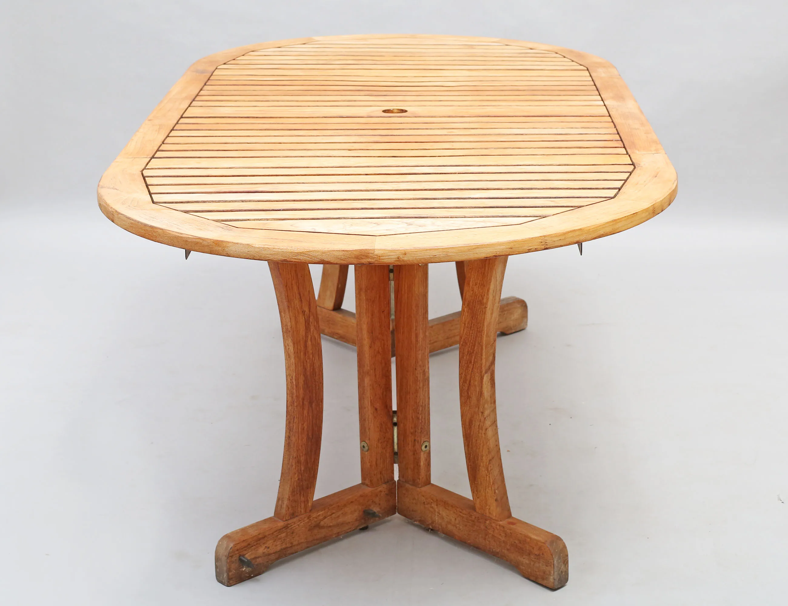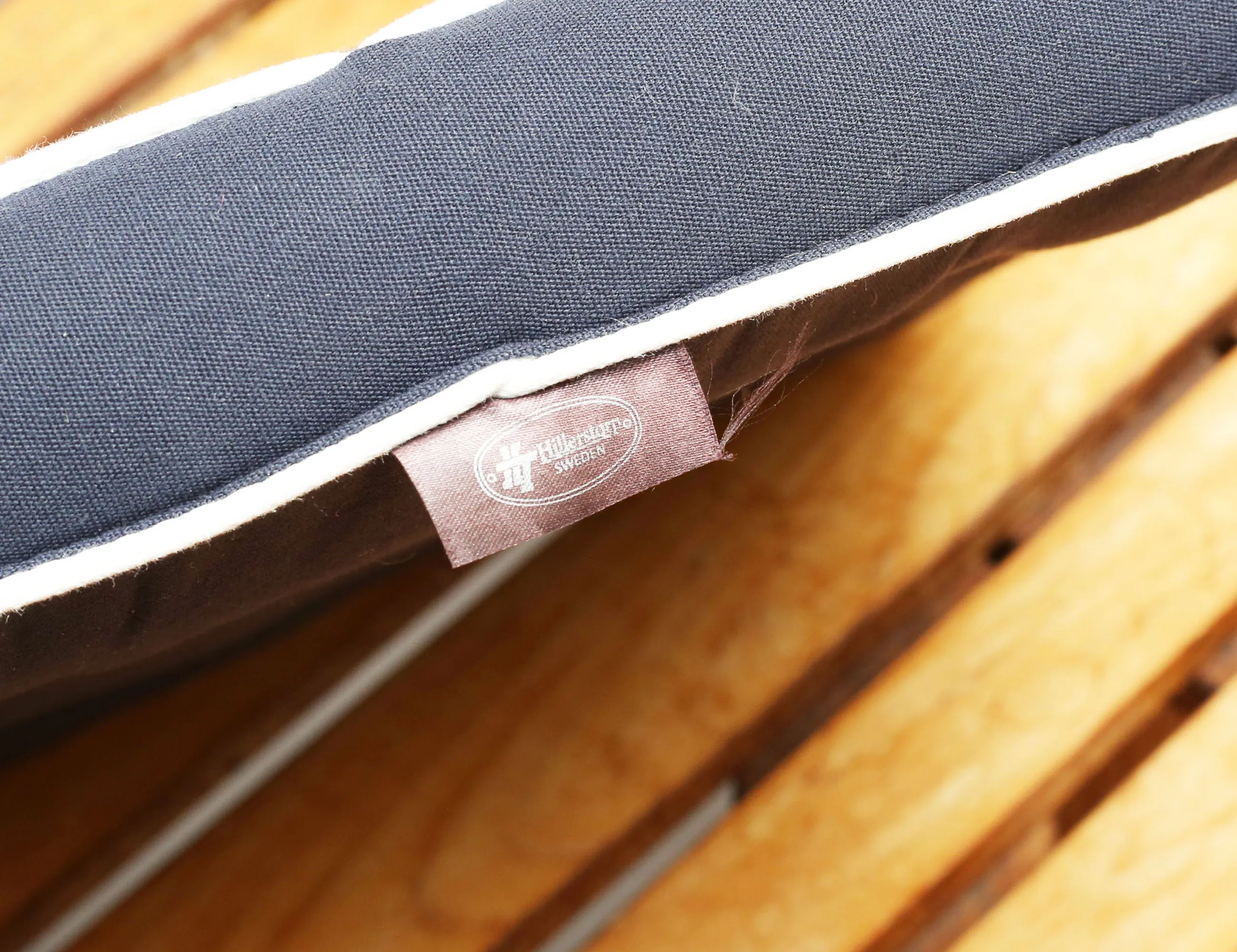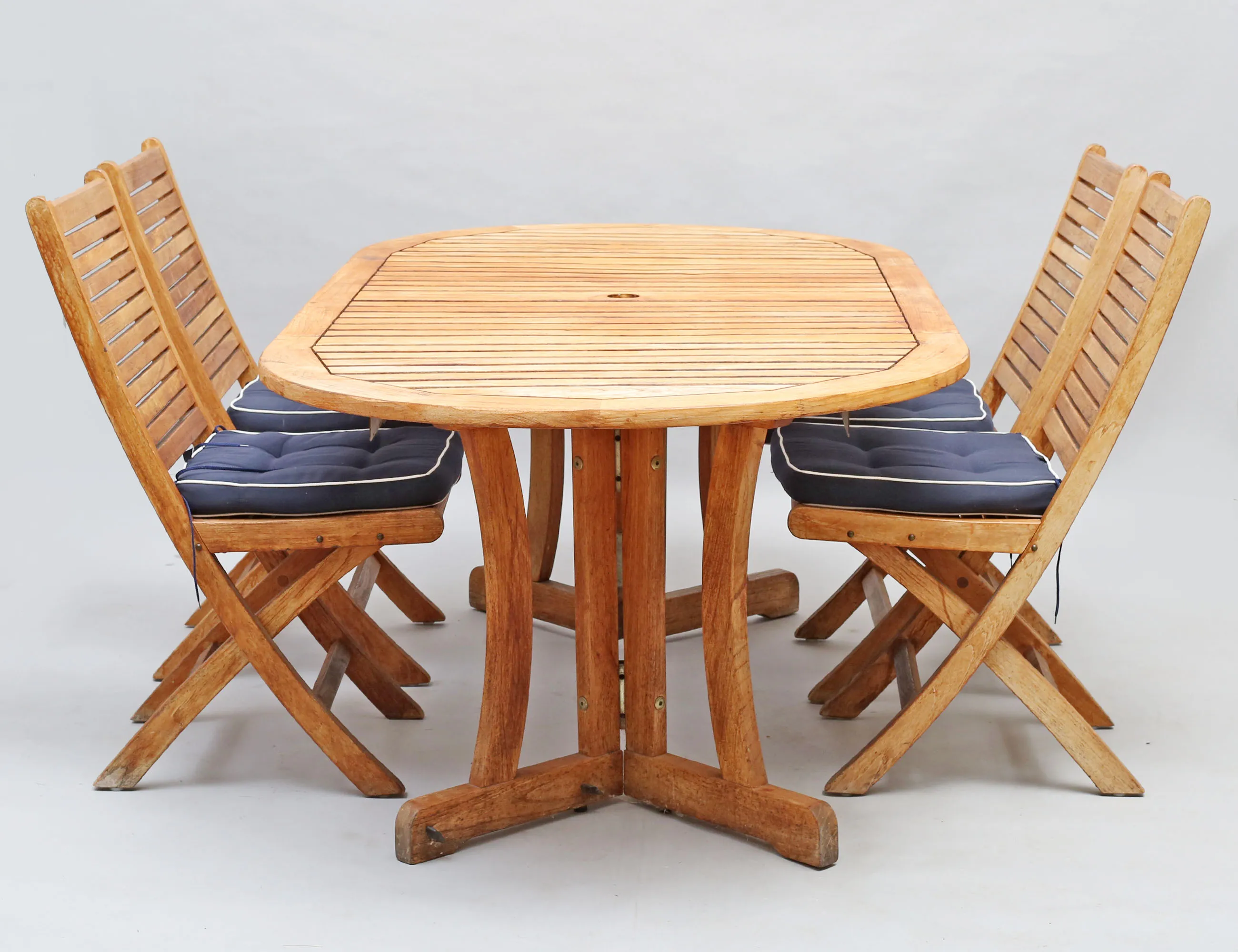 6 hopfällbara stolar samt bord med en iläggsskiva, teak, lösa dynor märkta Hillerstorp höjd 70, bredd 100, längd 120 (200) (smärre bruksslitage)