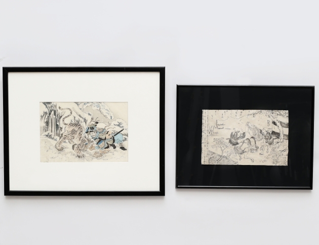 Kita Busei 1776-1856, färgträsnitt - stridscen mellan en krigare och tiger, 18x26, rammått 39x48, Kino Tsurayuki 1797-1861, krigare med häst samt dikt, 16,5x25, rammått 31x41 (2)
