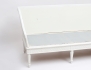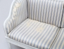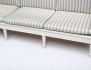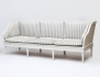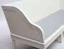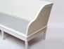 troligen Stockholmsarbete, högklassig, träskuren dekor av bandfläta och pärlstav, runda nedåt avsmalnande ben med kannelyr, bemålad, lösa stoppade plymåer, höjd 84, bredd 228, djup 68 (två bakre stödben kompletterade, tyg med skador)