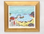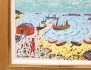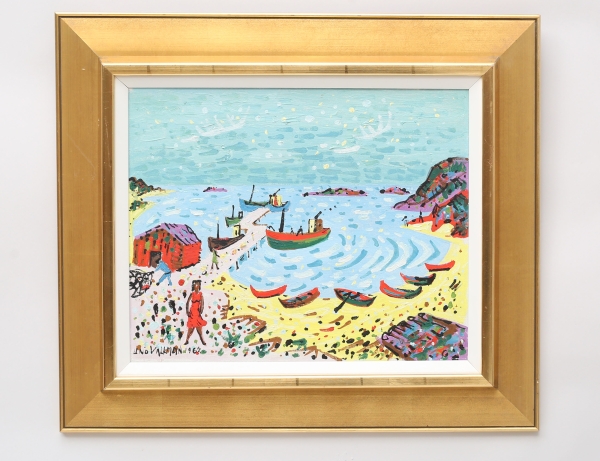 oljemålning på duk, kvinna i röd klänning vid fiskehamn, signerad 1962, atergo anteckningar, 33x41, rammått 50x58