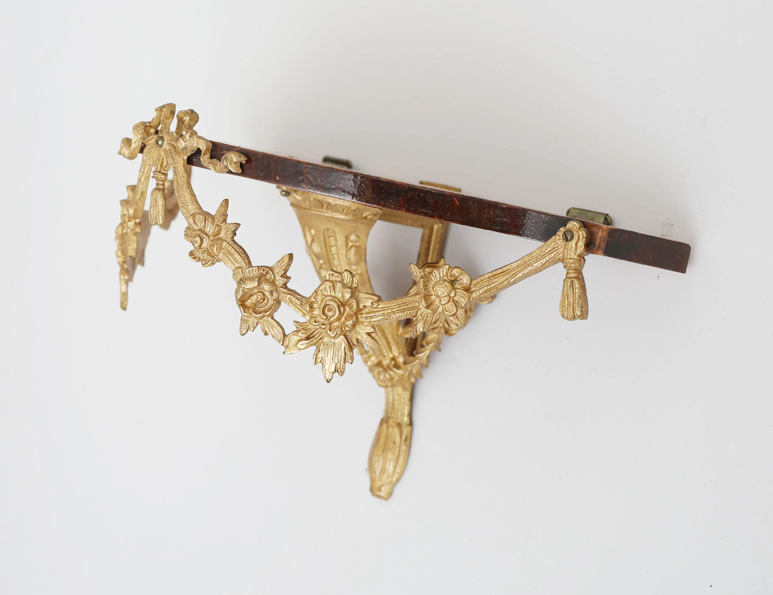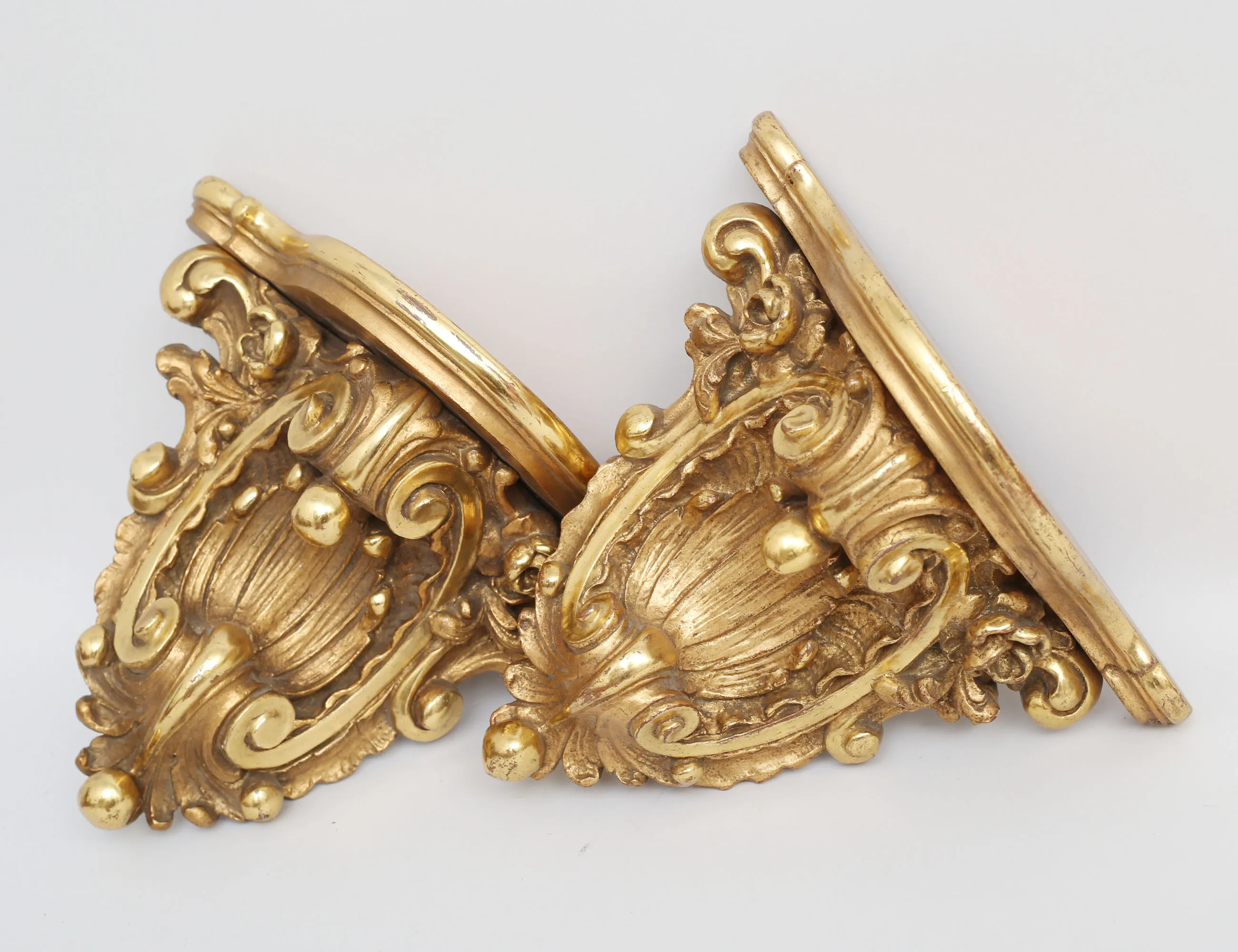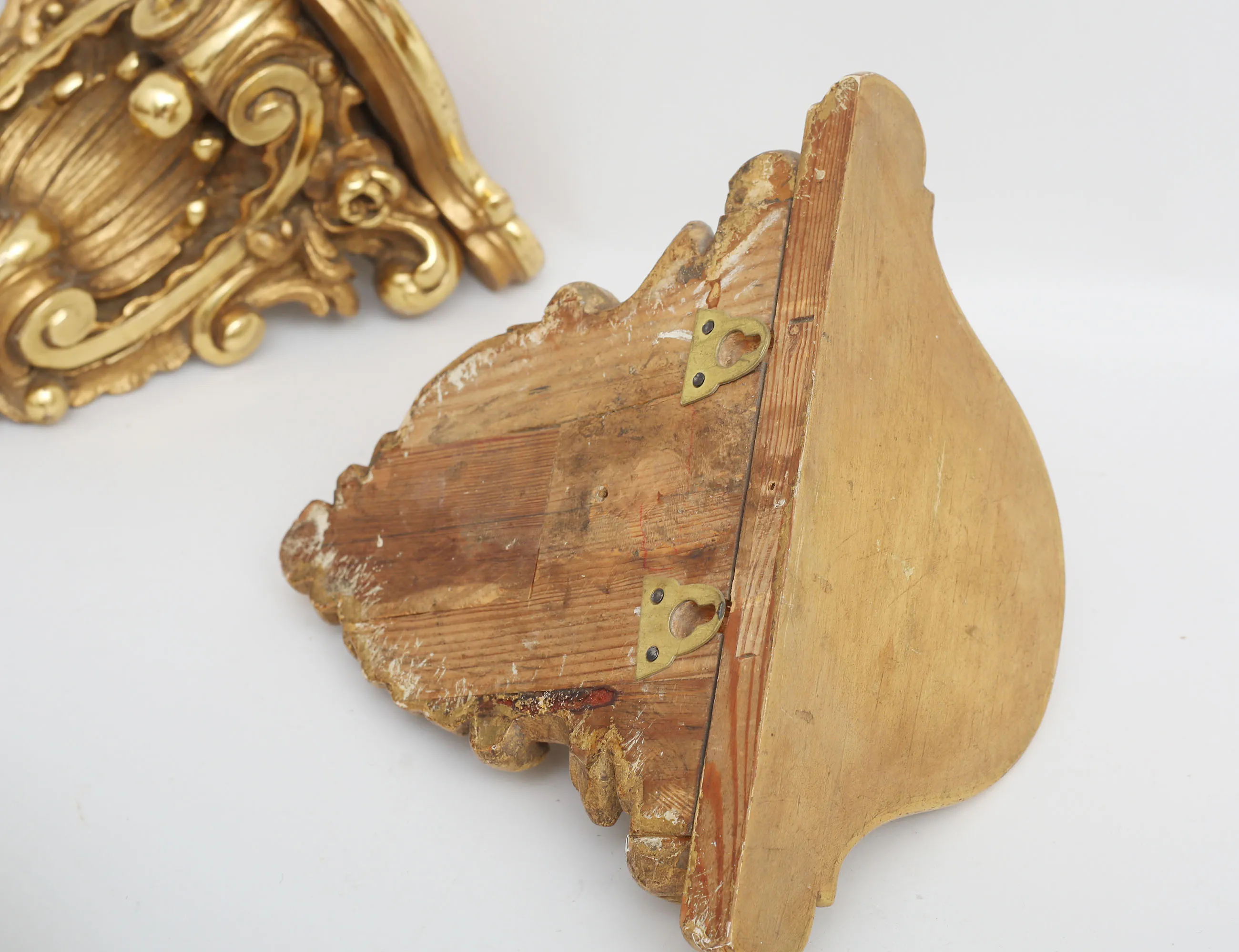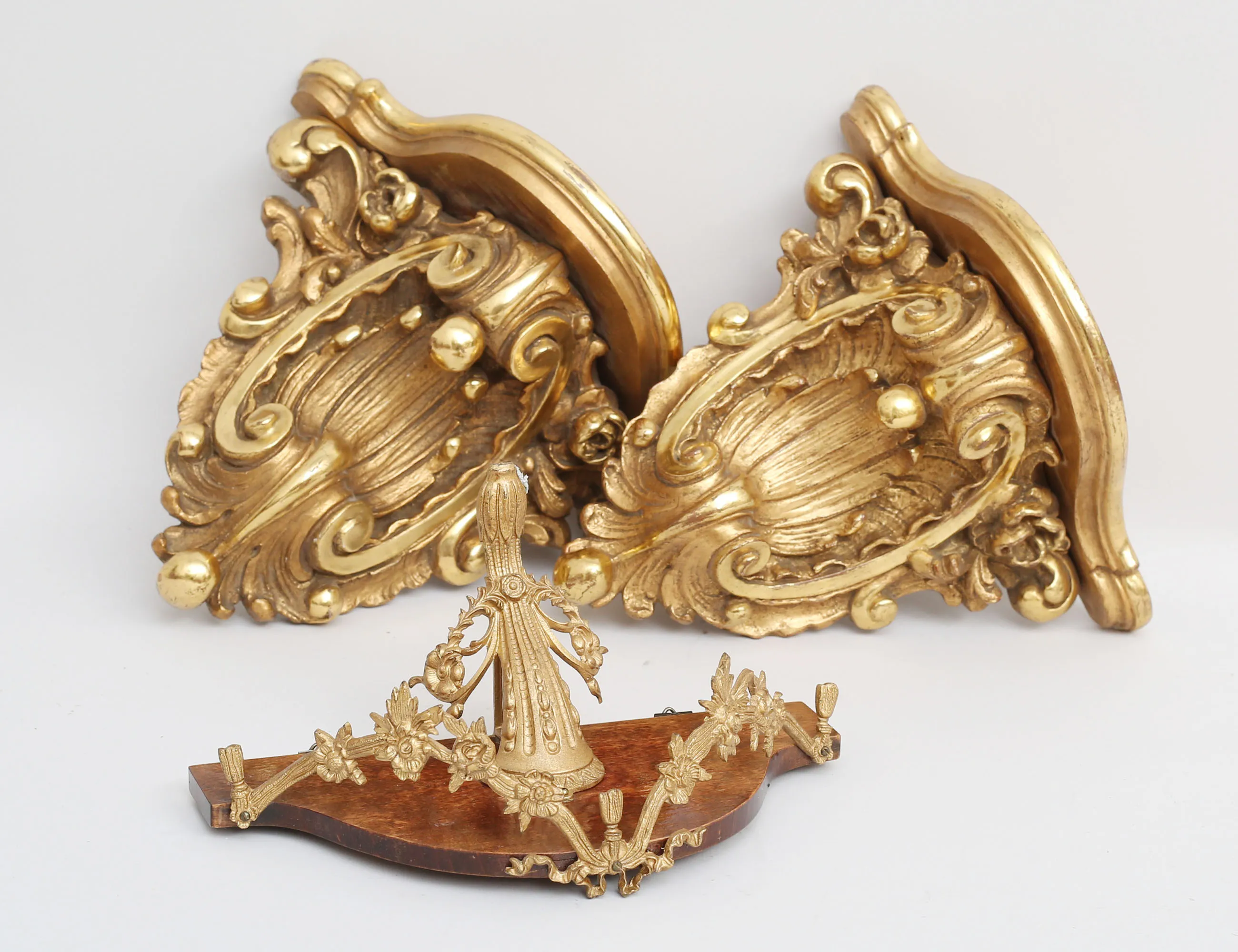 sent 1800-tal/c.1900, skuret trä förgyllt med bladguld och slagmetall, höjd 21, bredd 26, väggkonsol Louis XVI-stil, tidigt 1900-tal, bronserad metall, trä, höjd 12, bred 25 (3)