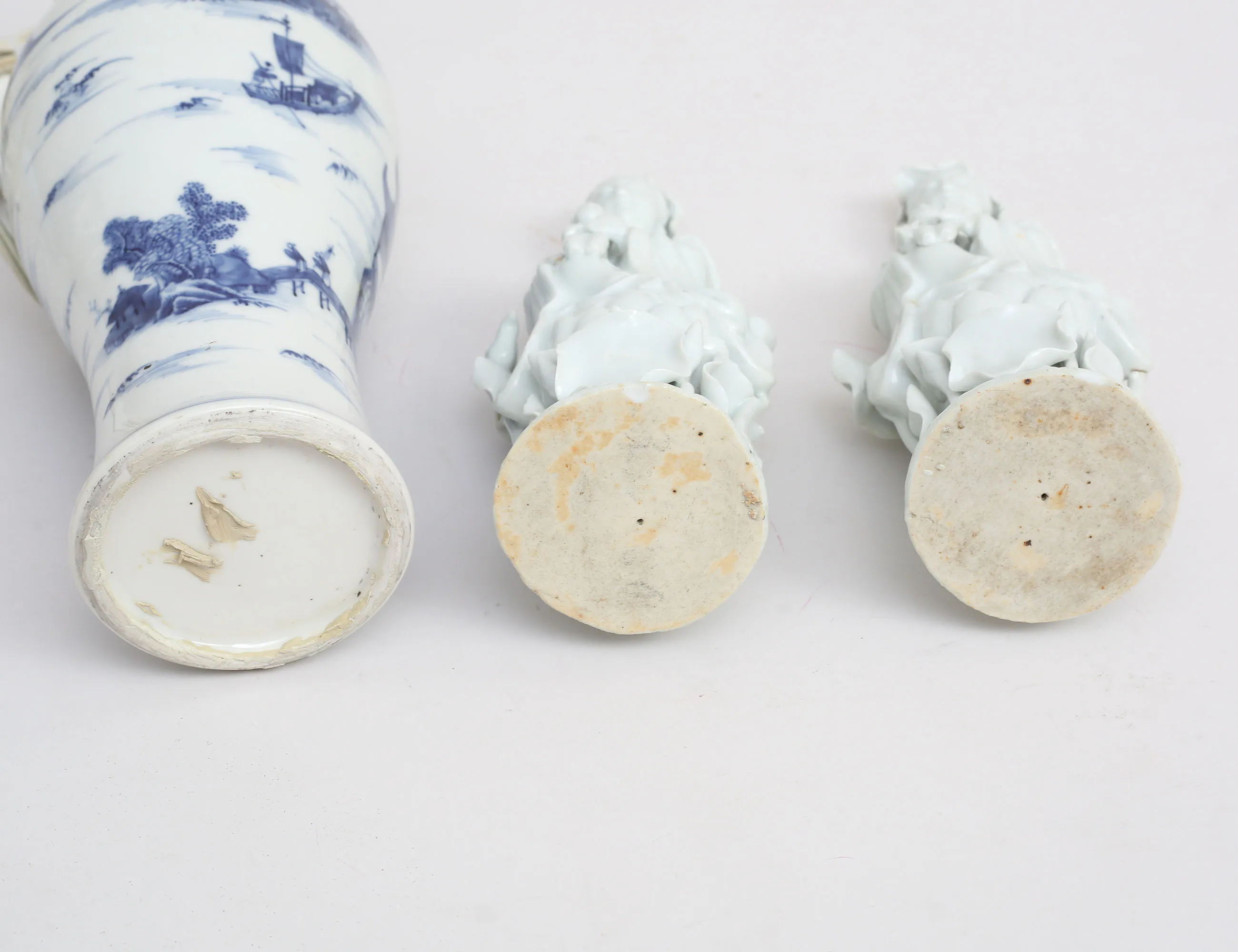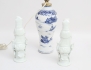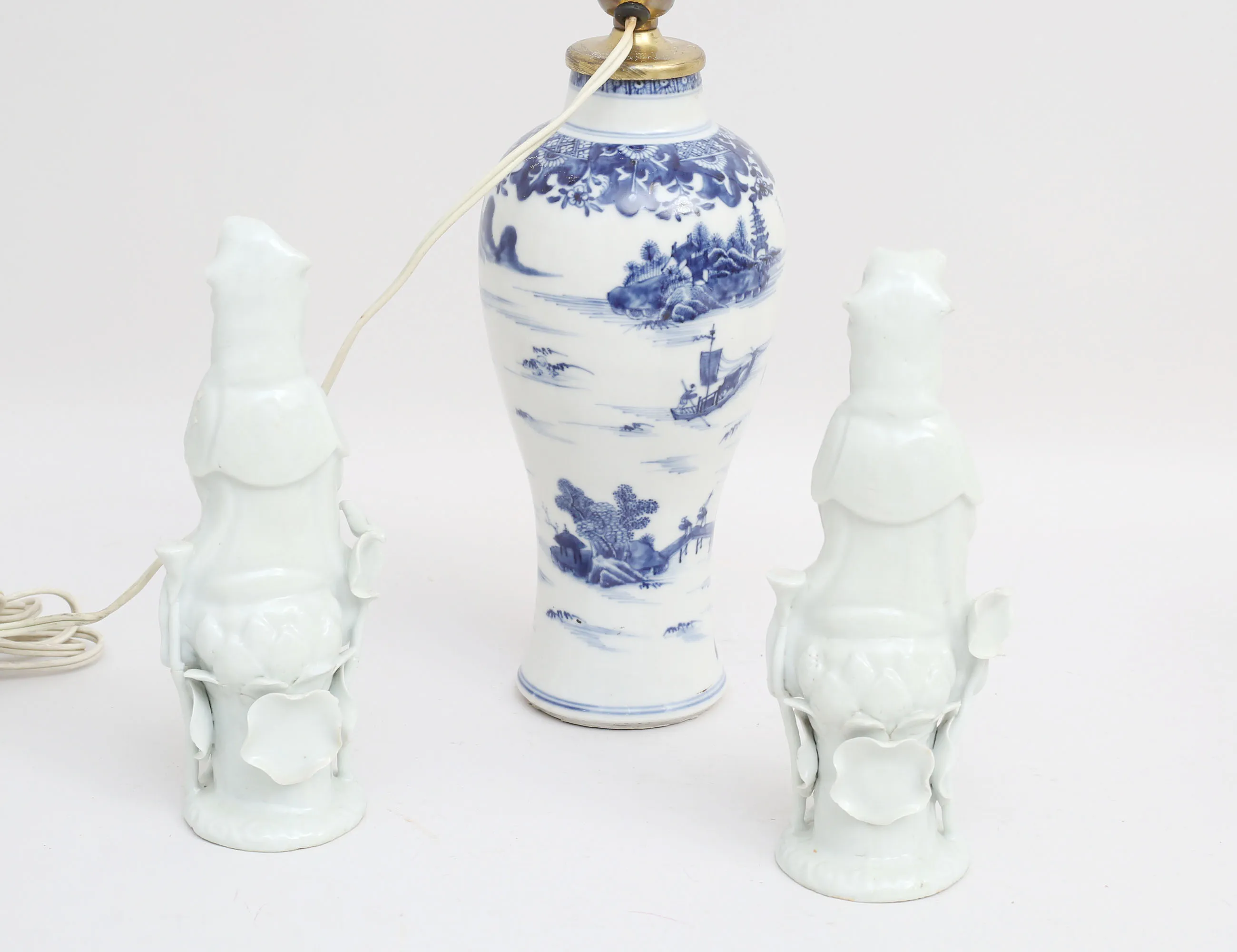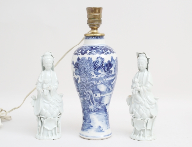 blåvit underglasyrdekor, senare monterad till bordslampa, höjd 33, figuriner 1 par Kina 1900-tal, blanc de chine, höjd 22 (naggar) (3)