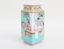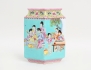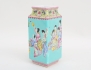 rombformad, polykrom dekor i emaljfärger av sammanhängande figurscener på fyra sidor, bottenmärke, höjd 15,5