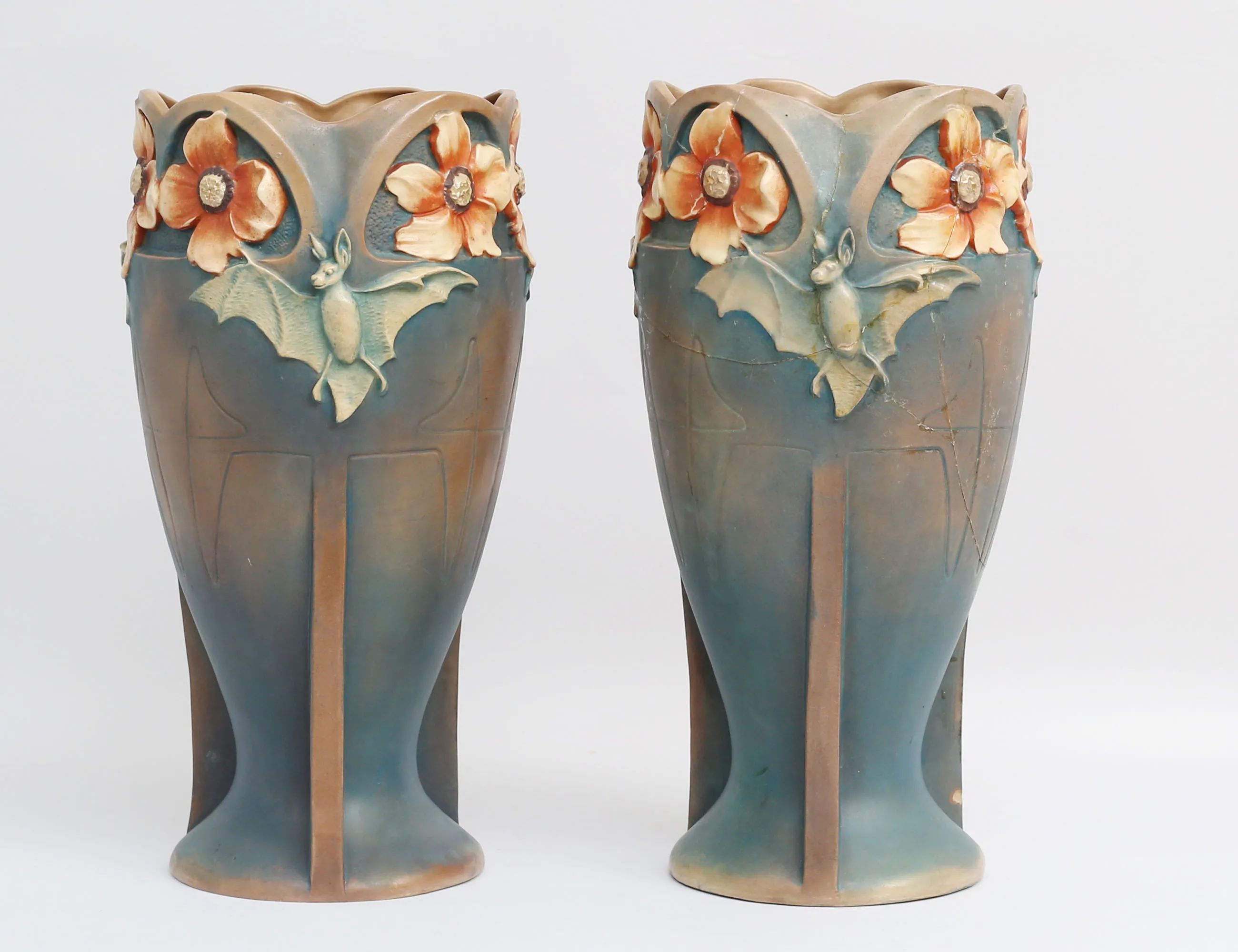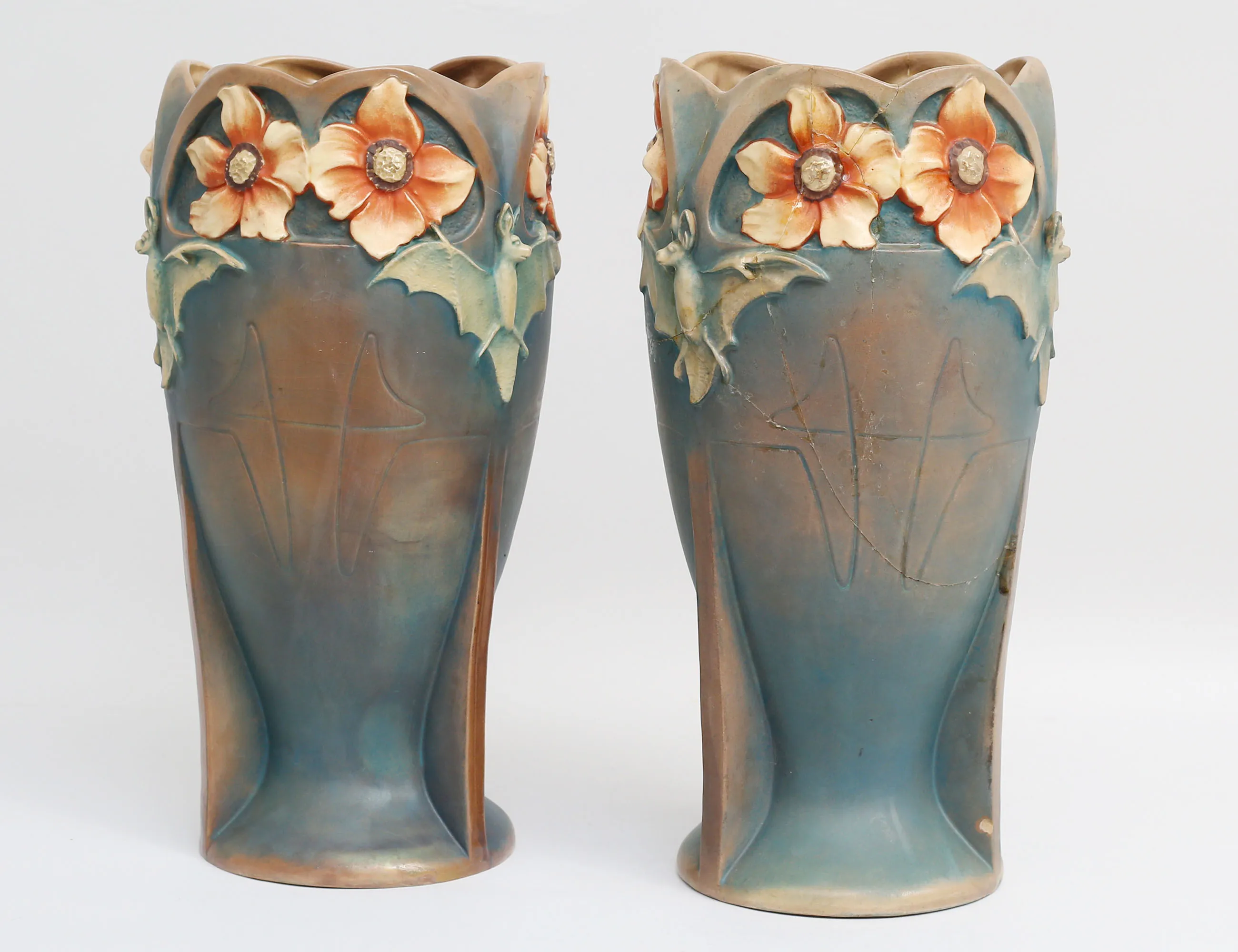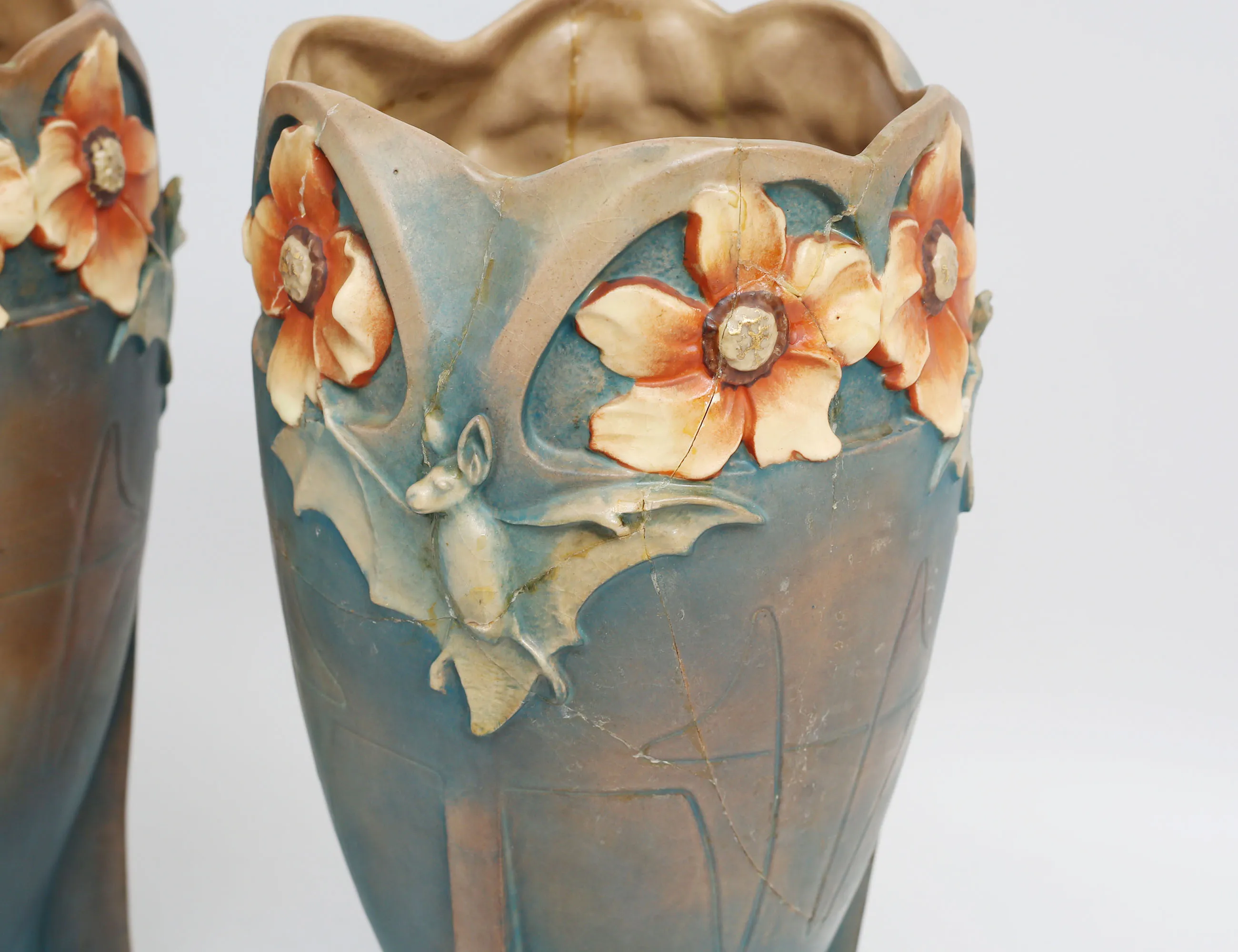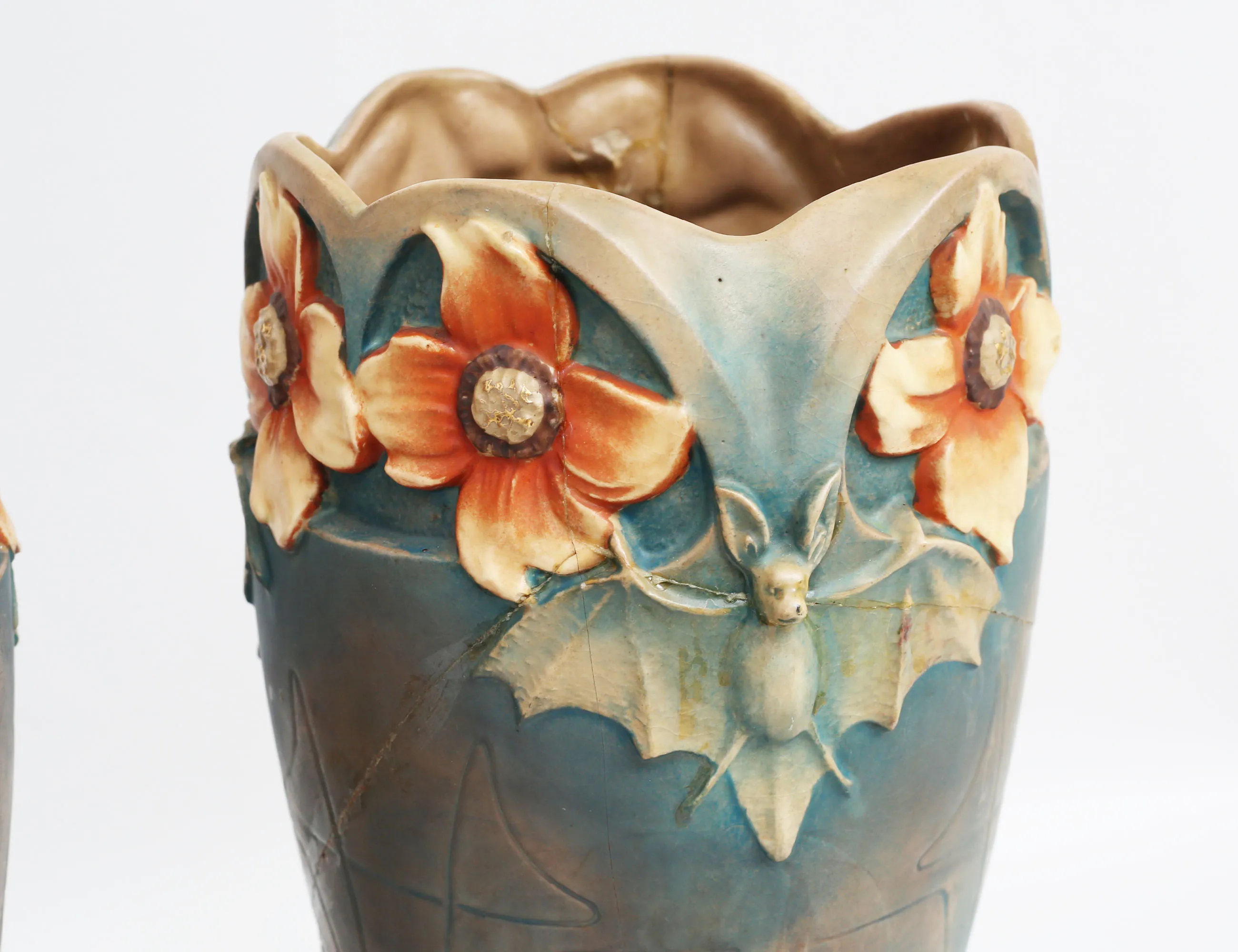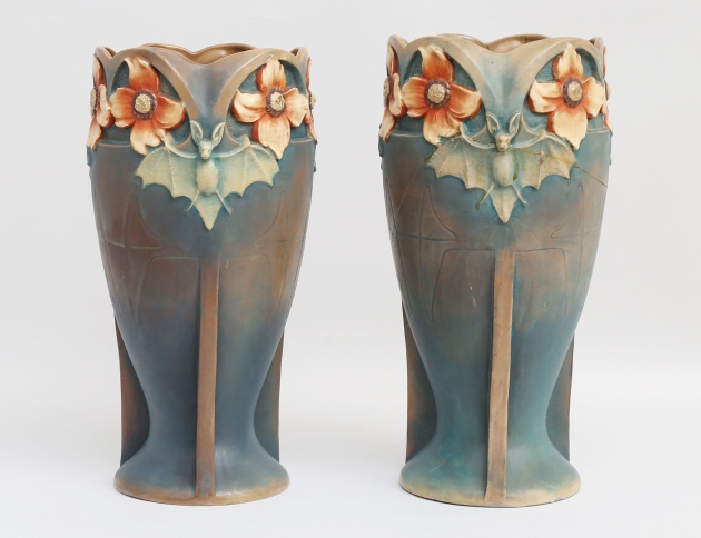 Bernard Bloch Tyskland, keramik delvis glaserad, skulpterad dekor av fladdermöss och blommor, märkt BB8737, höjd 38 (en med omfattande lagningar samt nagg)