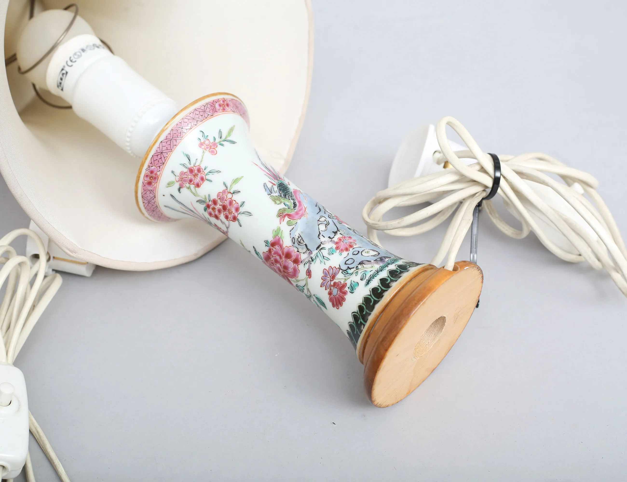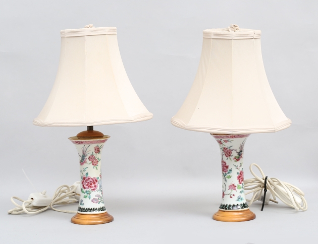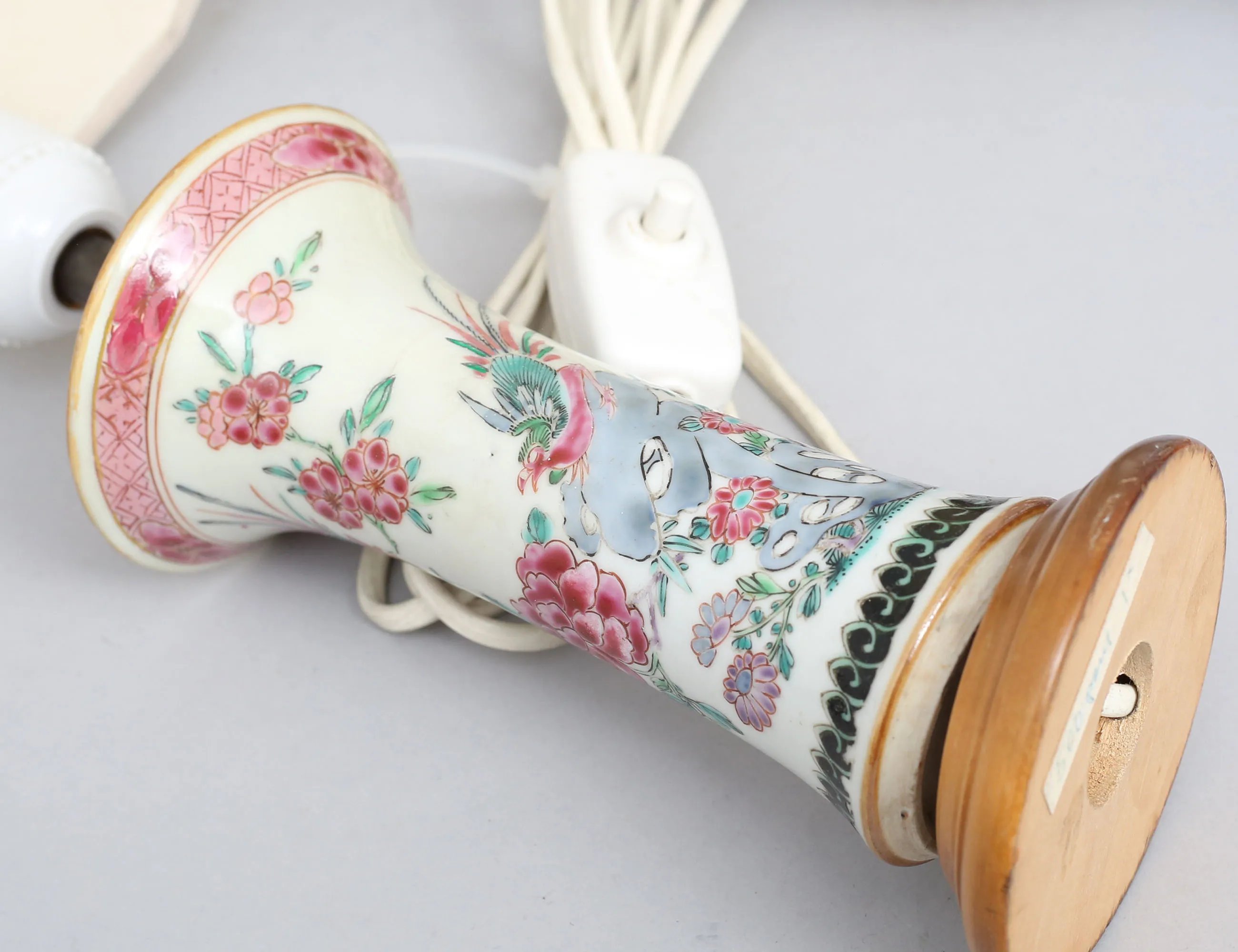 Qianlong 1736-1795, dekor i famille rose, senare monterade till bordslampor, textilskärmar, höjd 15, lampfot 23, inkl. skärm 35 (båda med avancerad konstlagning)