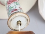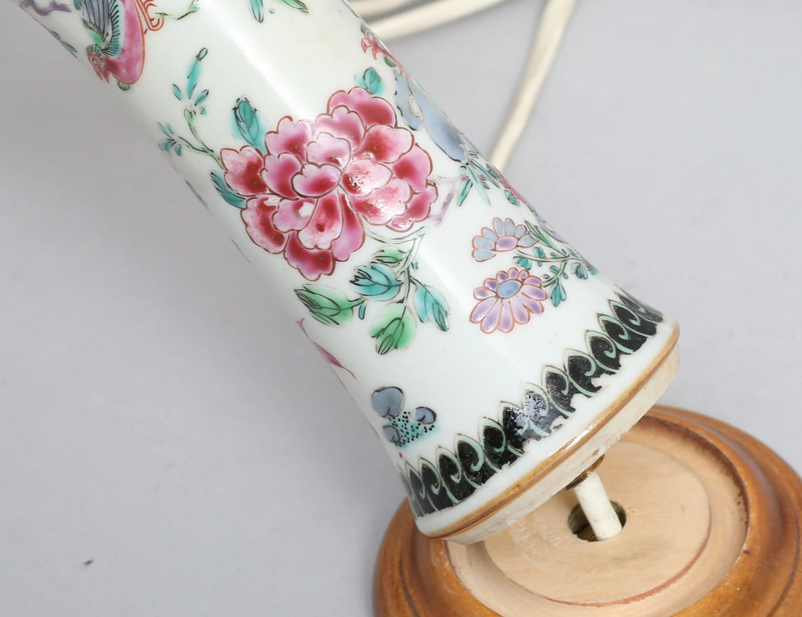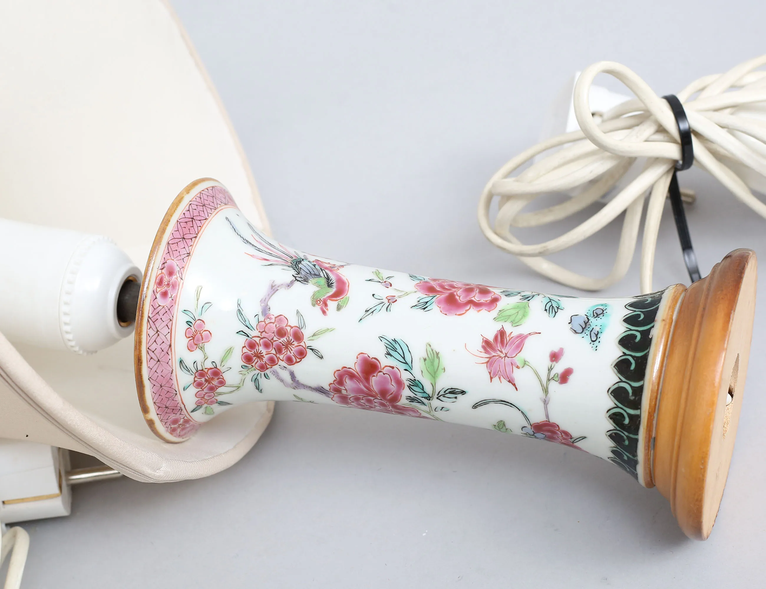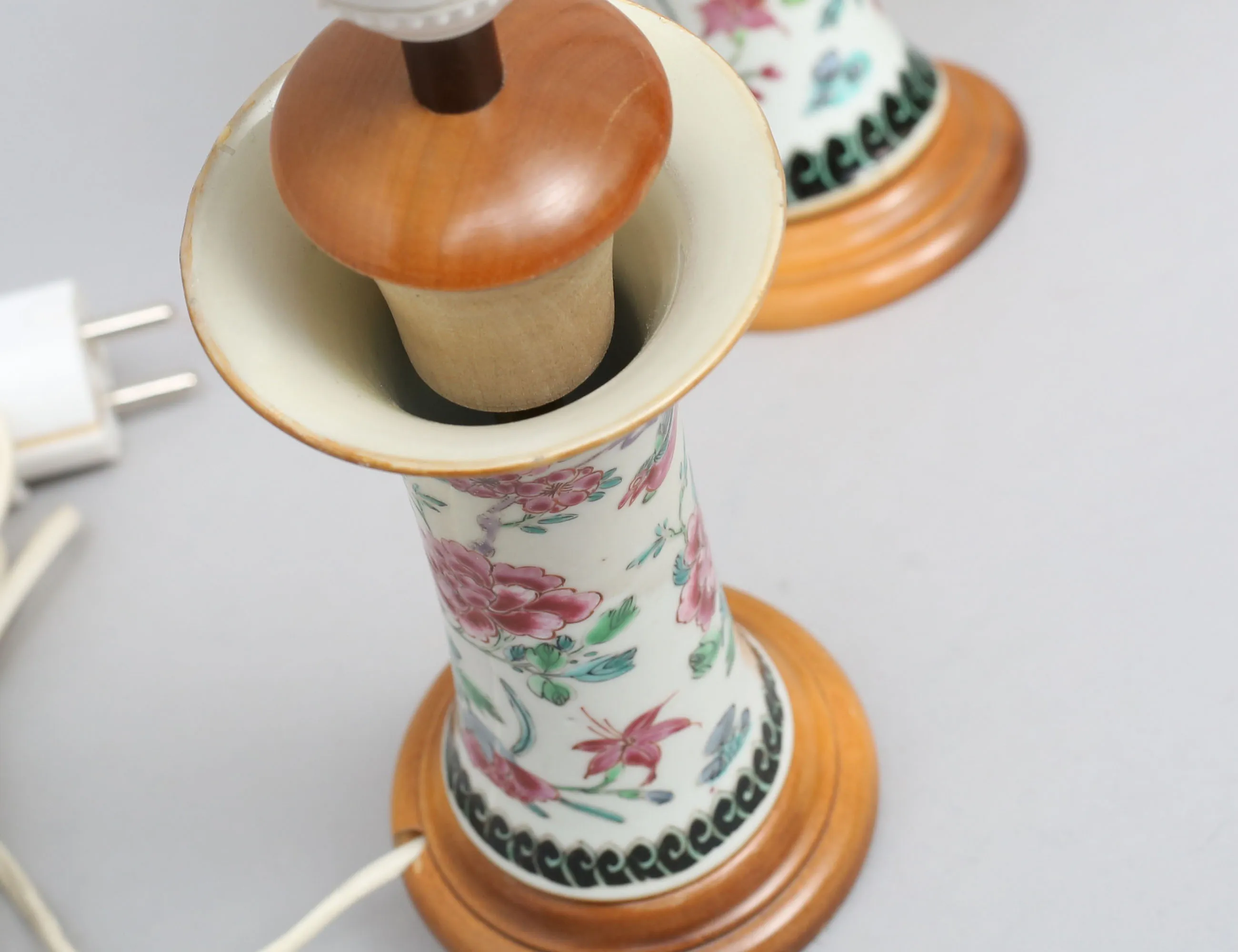 Qianlong 1736-1795, dekor i famille rose, senare monterade till bordslampor, textilskärmar, höjd 15, lampfot 23, inkl. skärm 35 (båda med avancerad konstlagning)