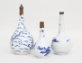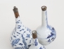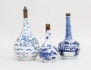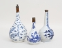 sen Qingdynasti, blåvit uderglasyrdekor, mynningsfästen i koppar, en med propp, höjd 14, 17, 19 (fotringsnaggar)
