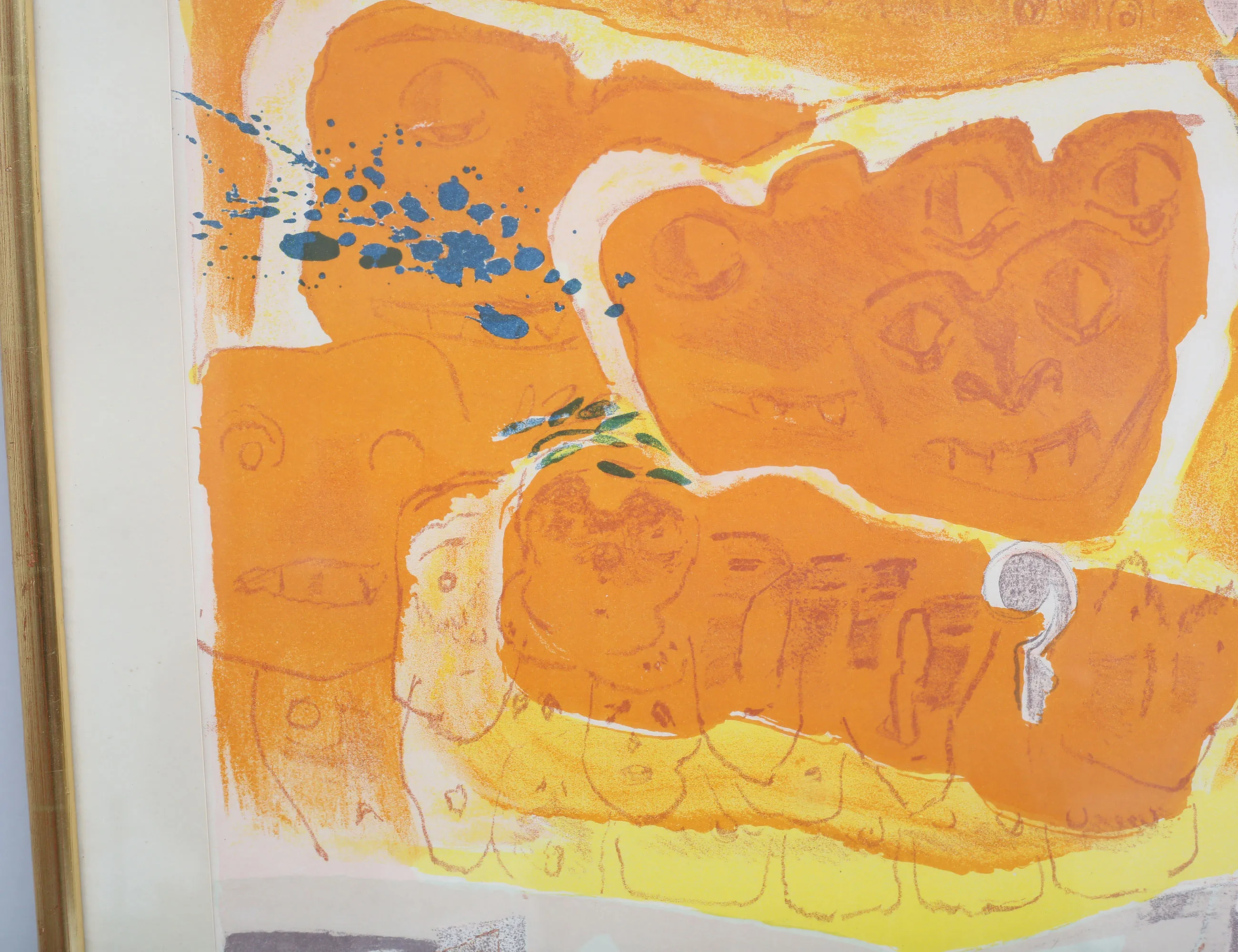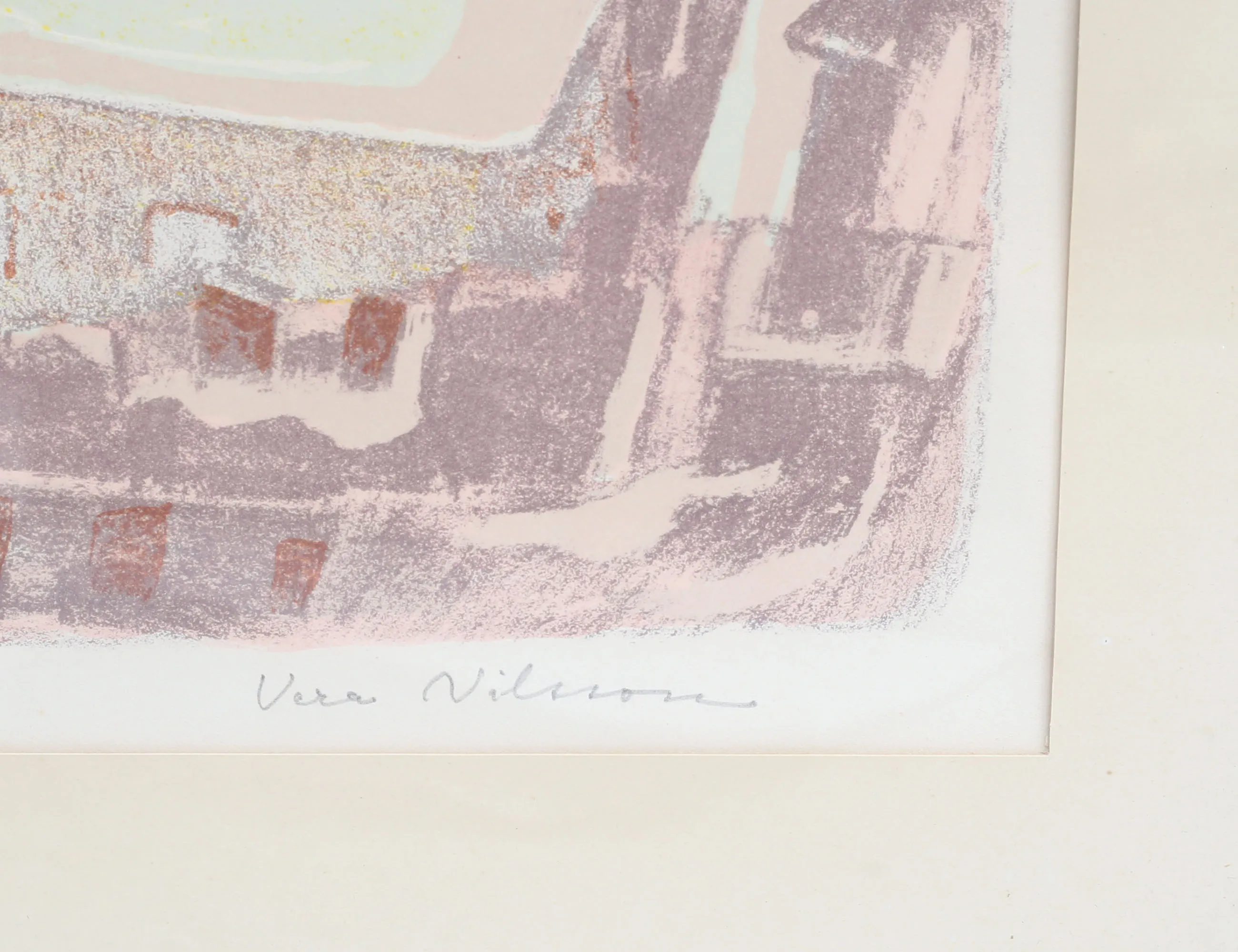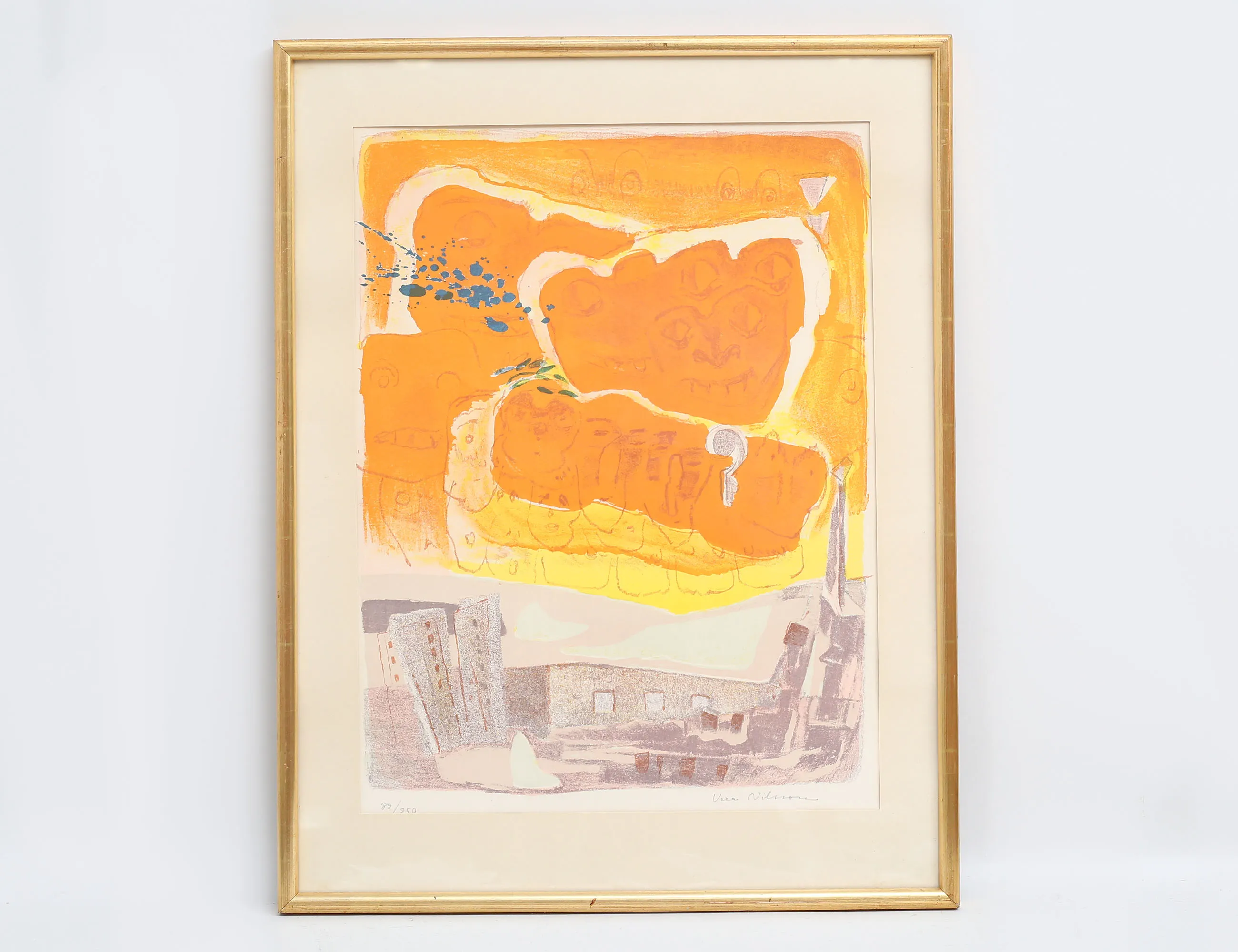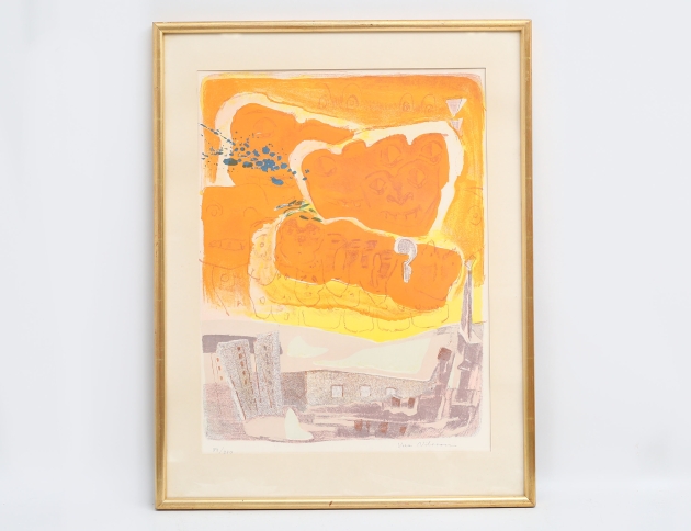 färglitografi 82/250, komposition med figurer och hus, signerad, bildmått 51x39, rammått 67x53 (något gulnad)