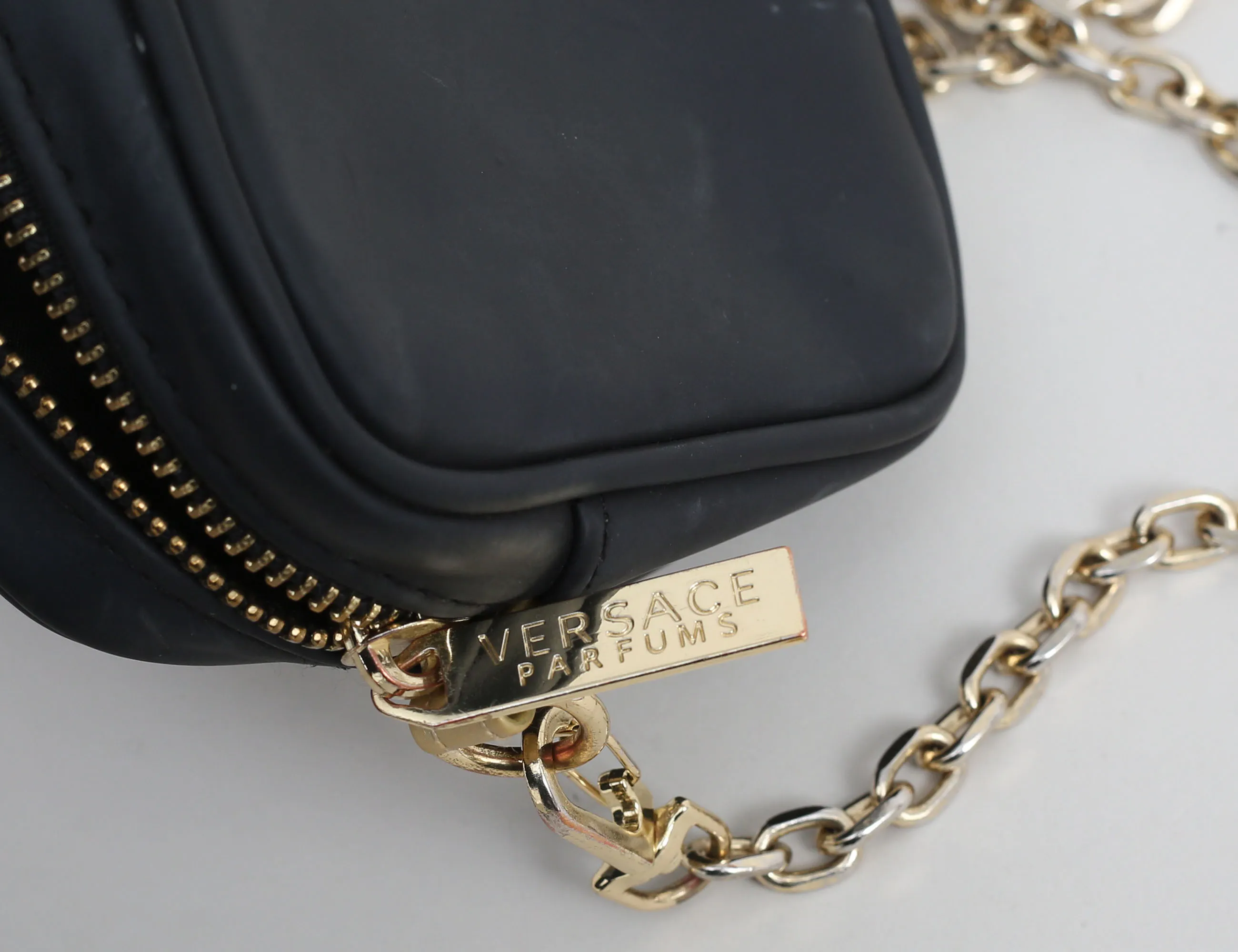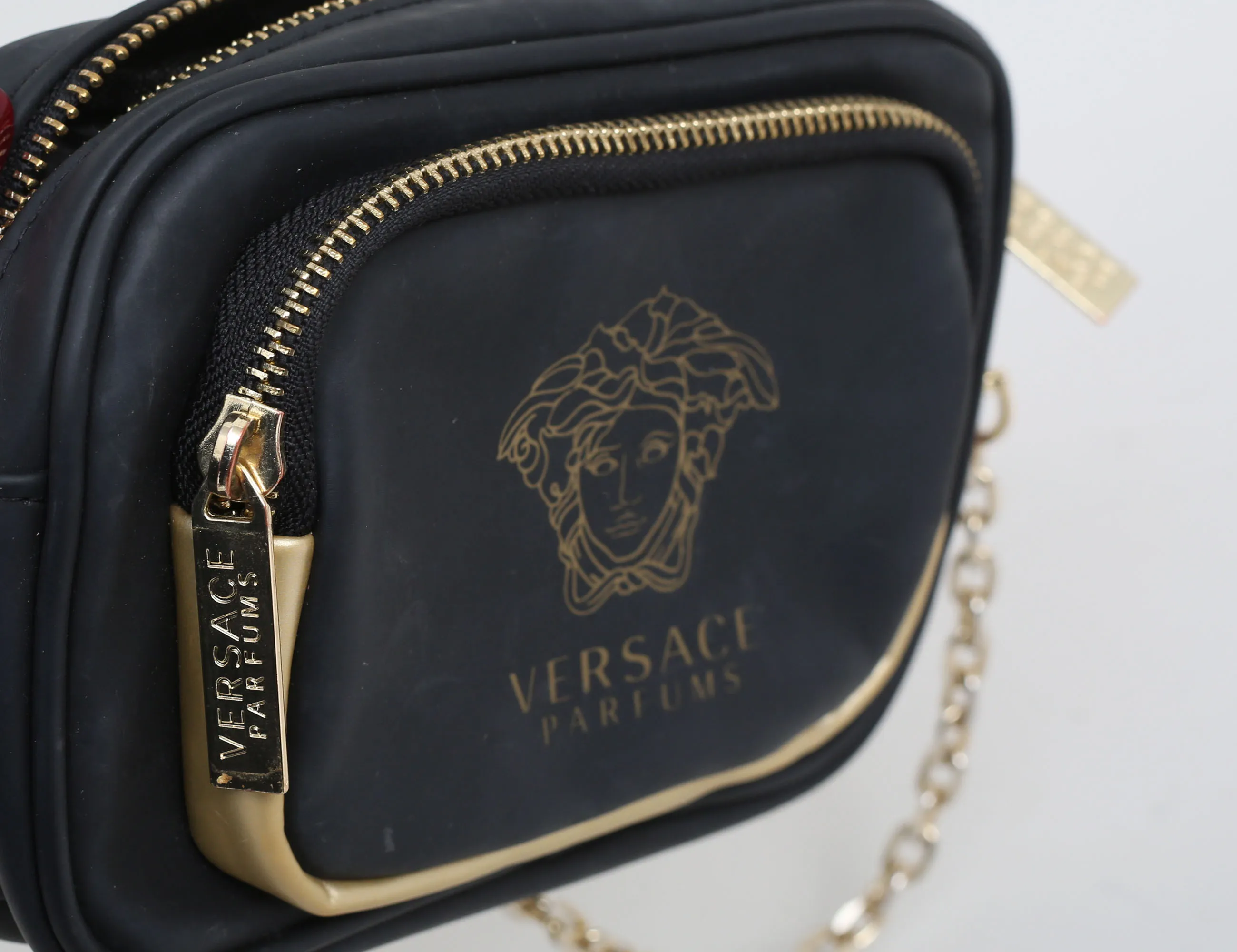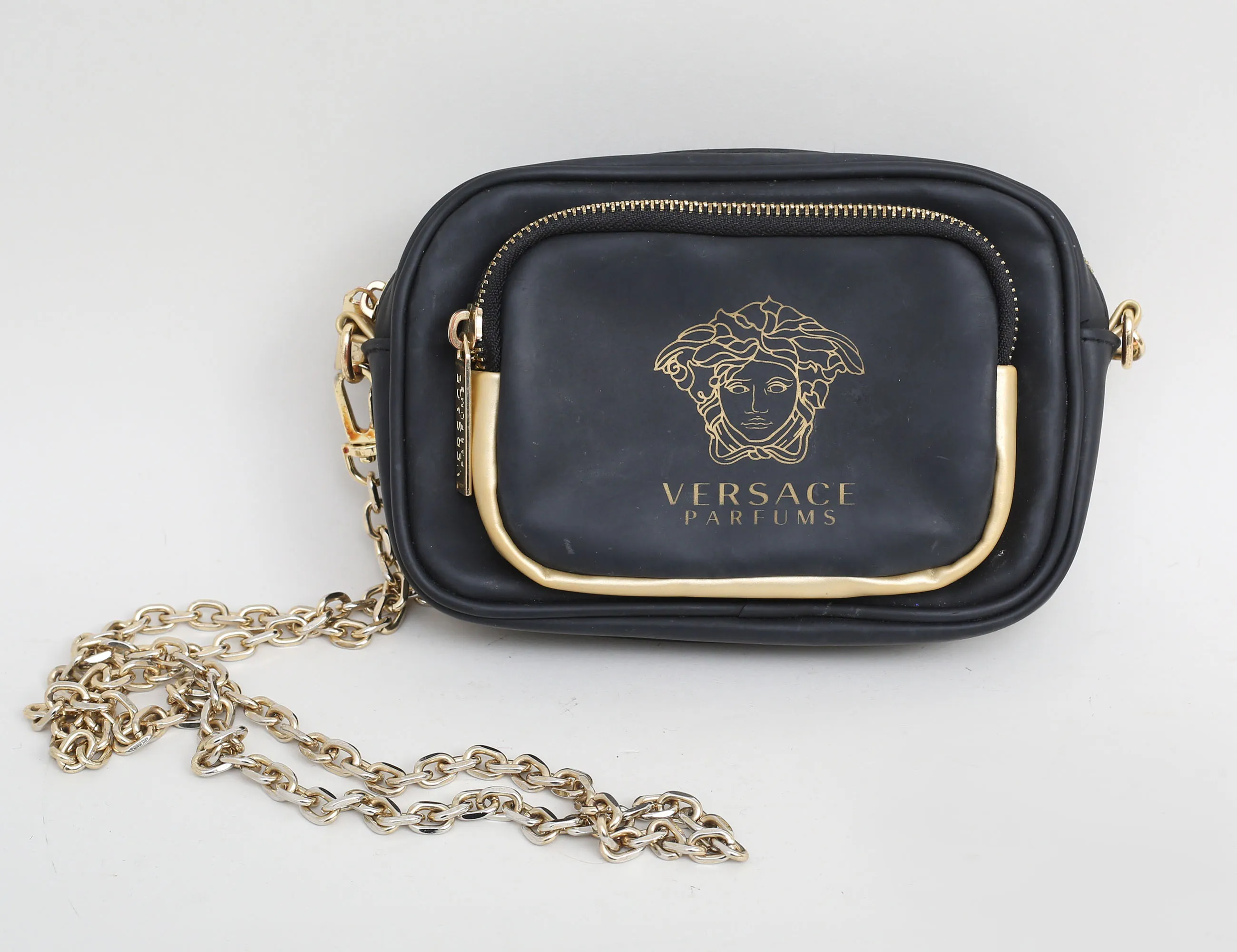 cross-body väska, svart pvc med detaljer i guld, medusa på framsidan, kedja i guldfärgad metall, höjd 11, bredd 17, djup 4 (GWP-gift with purchase, smärre bruksslitage)