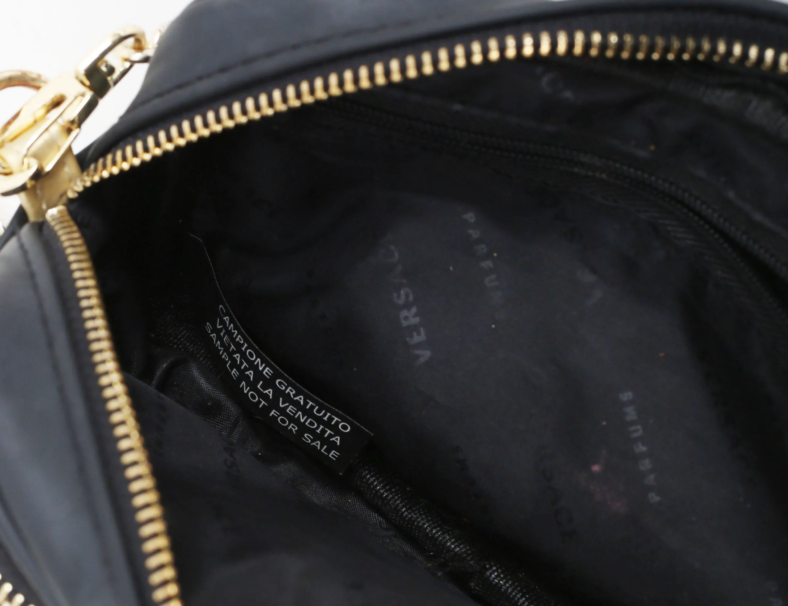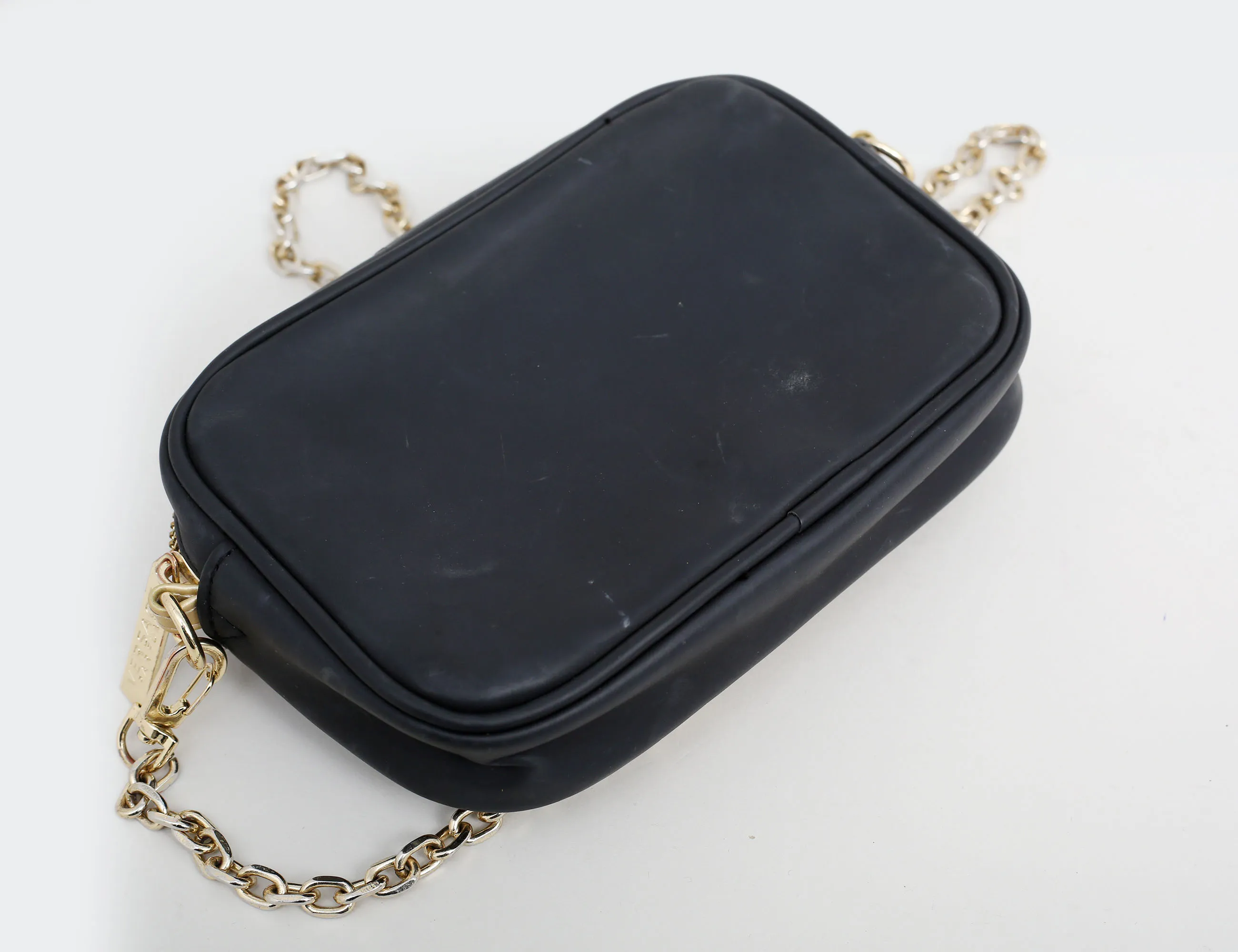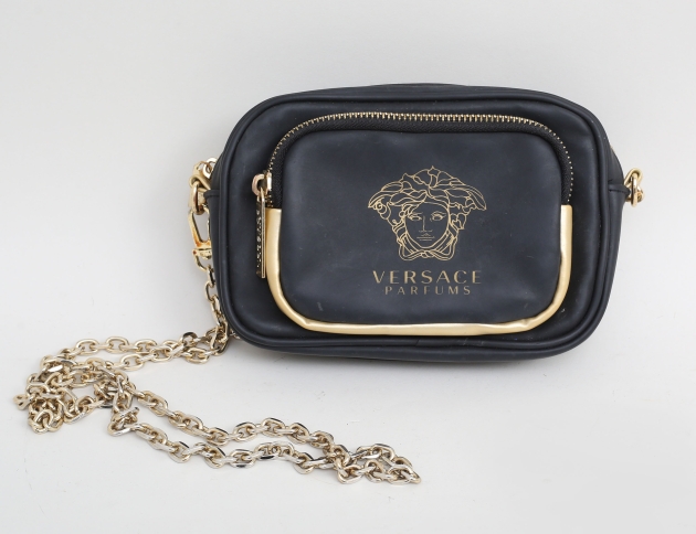 cross-body väska, svart pvc med detaljer i guld, medusa på framsidan, kedja i guldfärgad metall, höjd 11, bredd 17, djup 4 (GWP-gift with purchase, smärre bruksslitage)