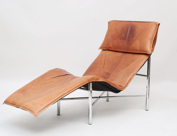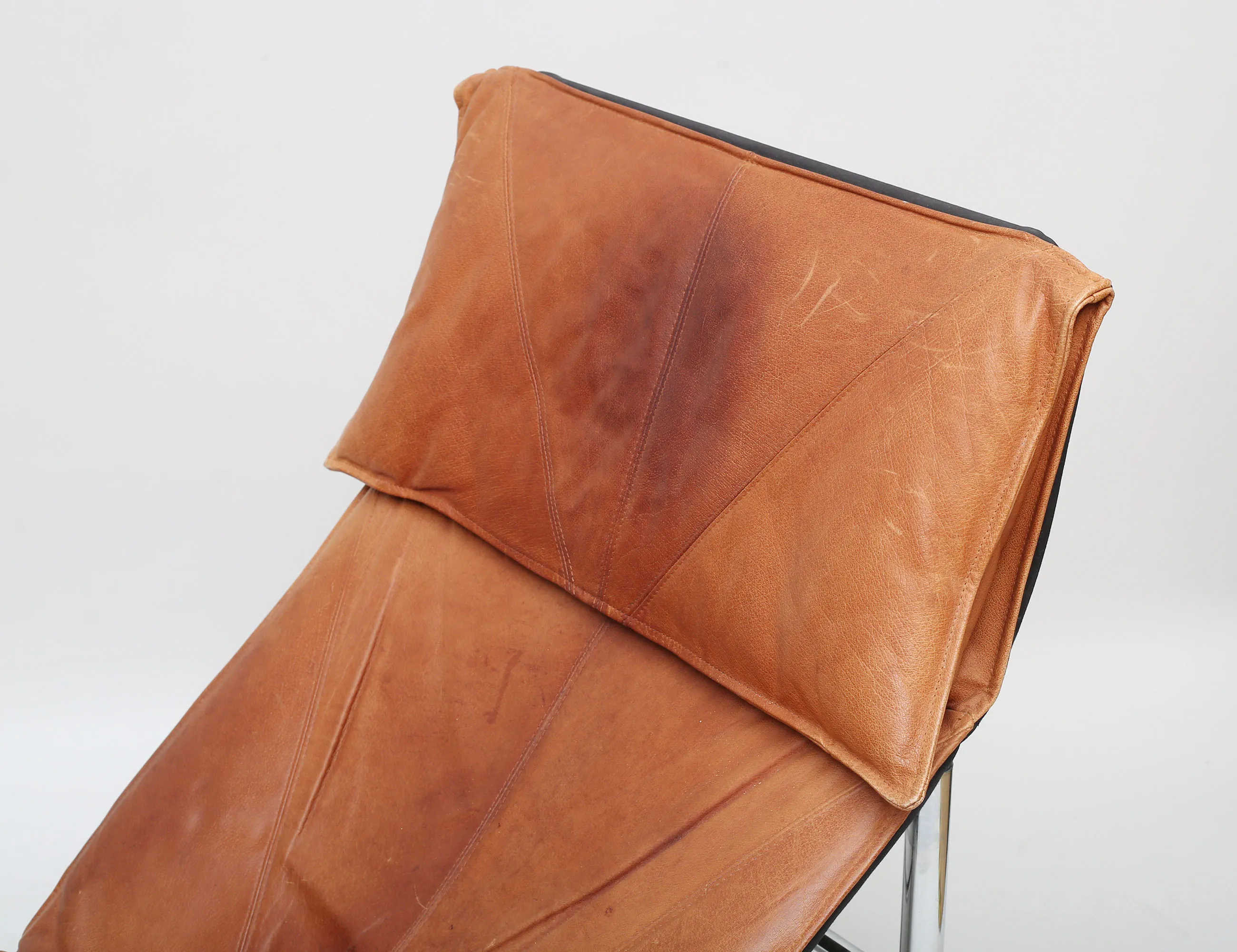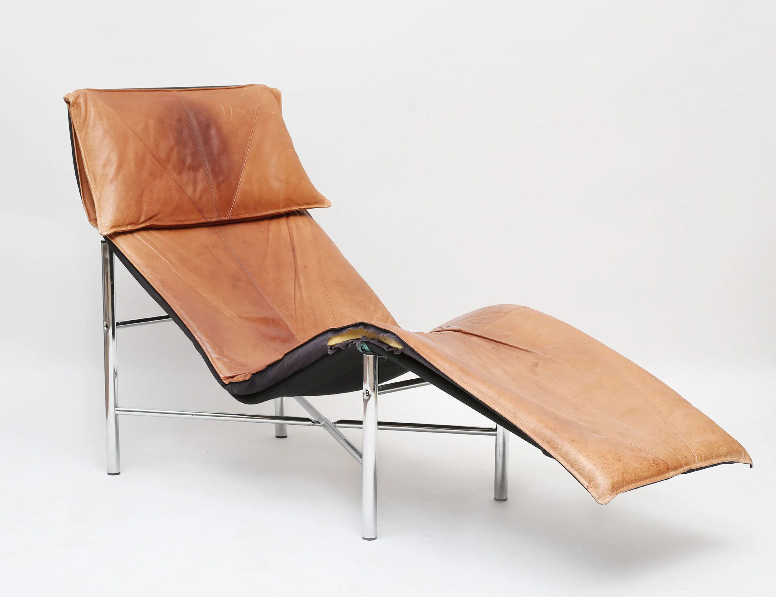 Tord Björklund för IKEA 1980-tal, benställning i kromad metall, klädsel av brunt skinn, sitthöjd 32, höjd 95, längd 160 (fläckar, ena sidan med skada vid fodret)