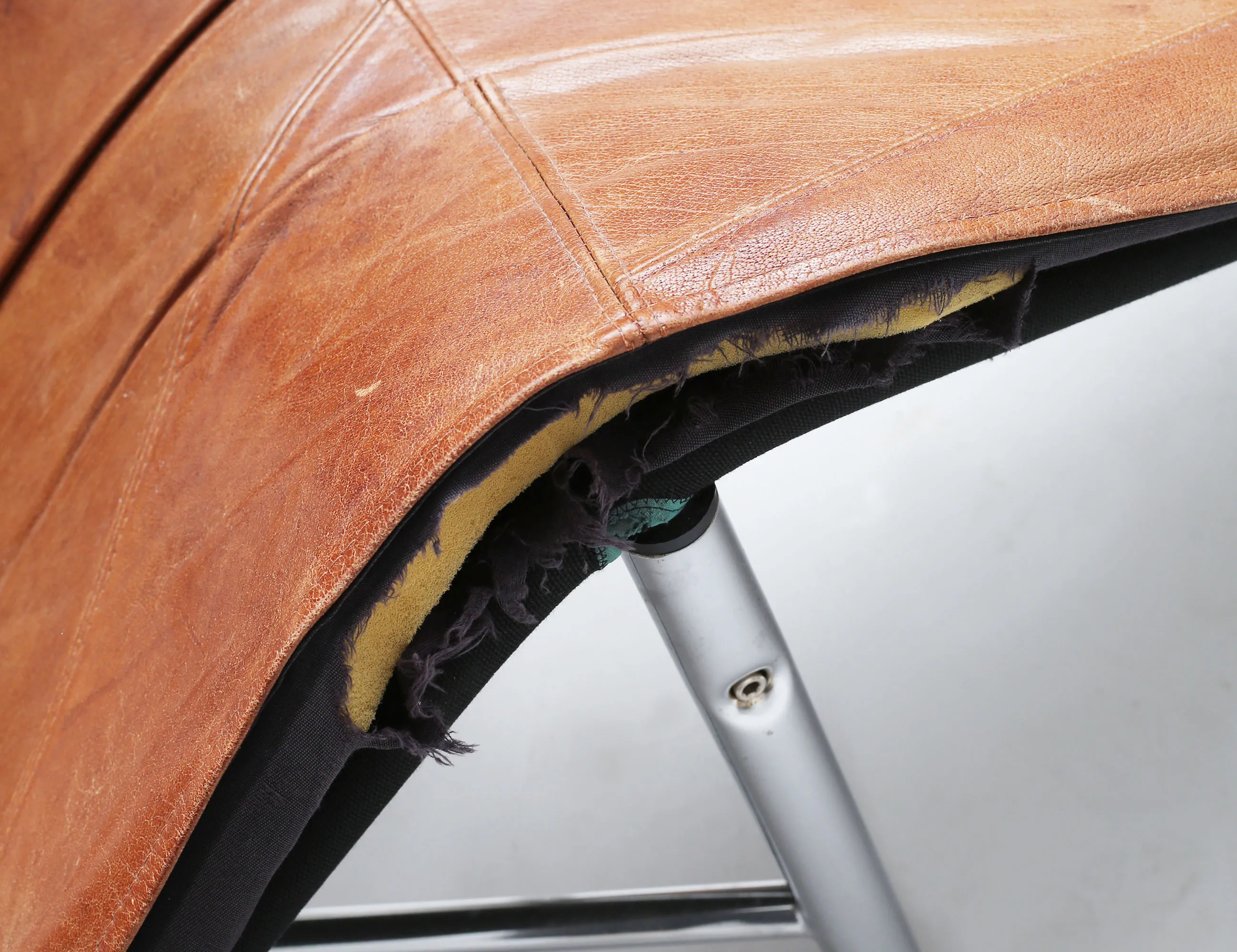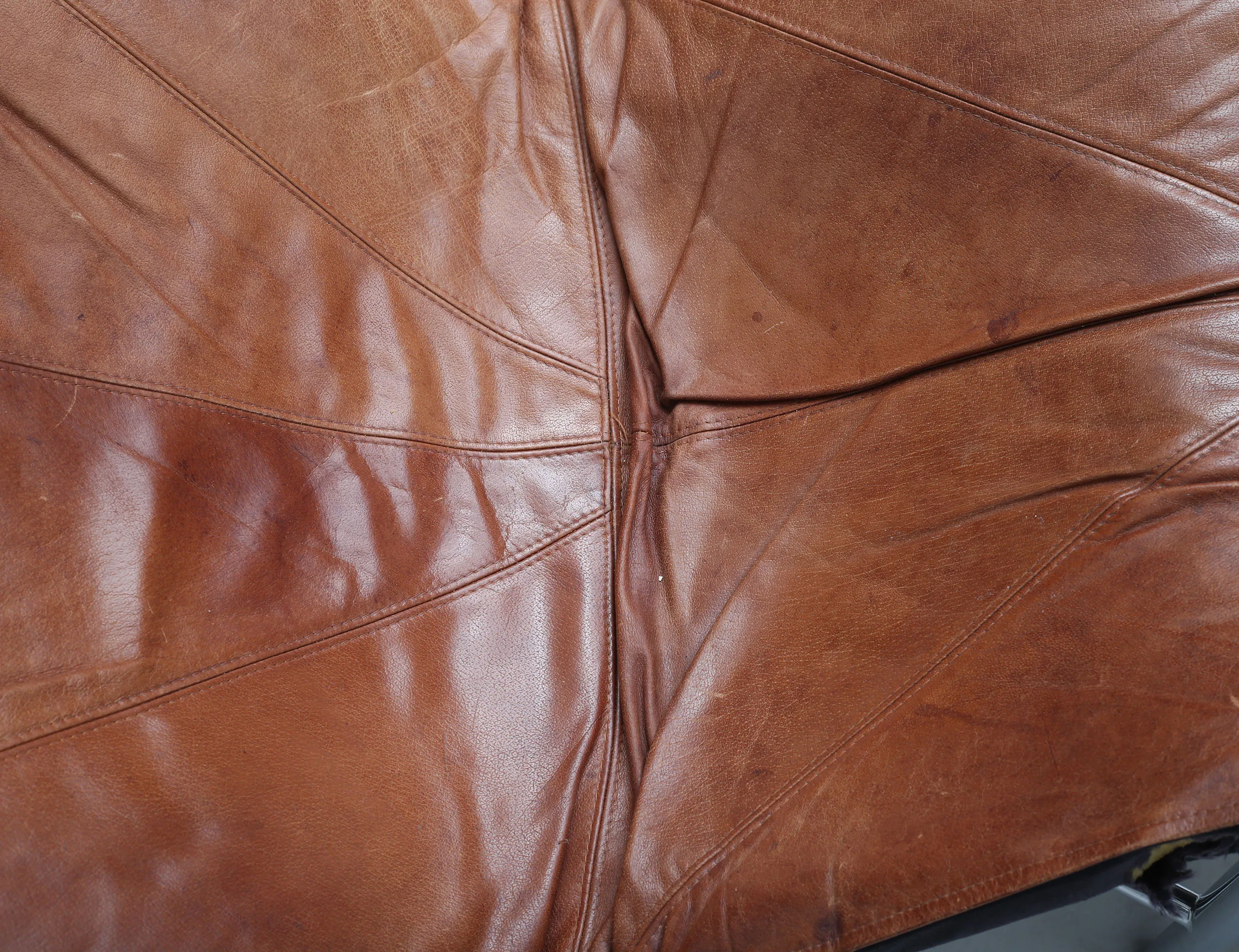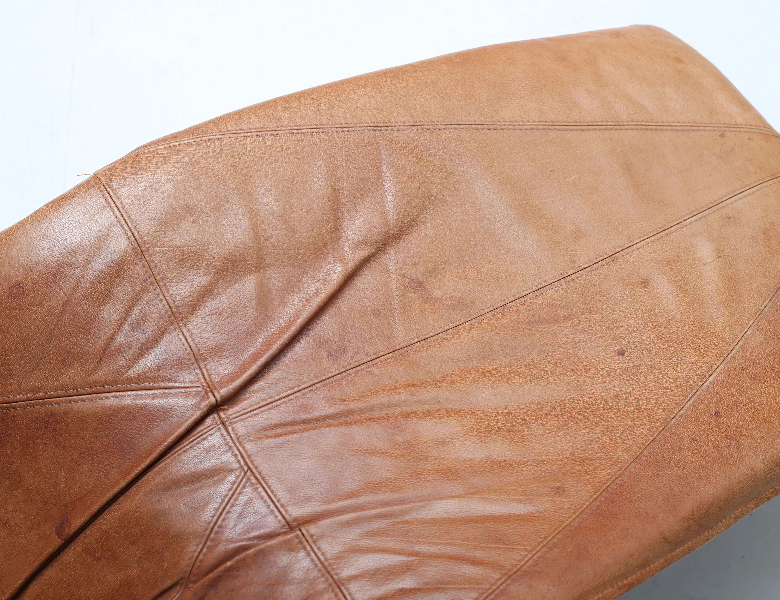 Tord Björklund för IKEA 1980-tal, benställning i kromad metall, klädsel av brunt skinn, sitthöjd 32, höjd 95, längd 160 (fläckar, ena sidan med skada vid fodret)
