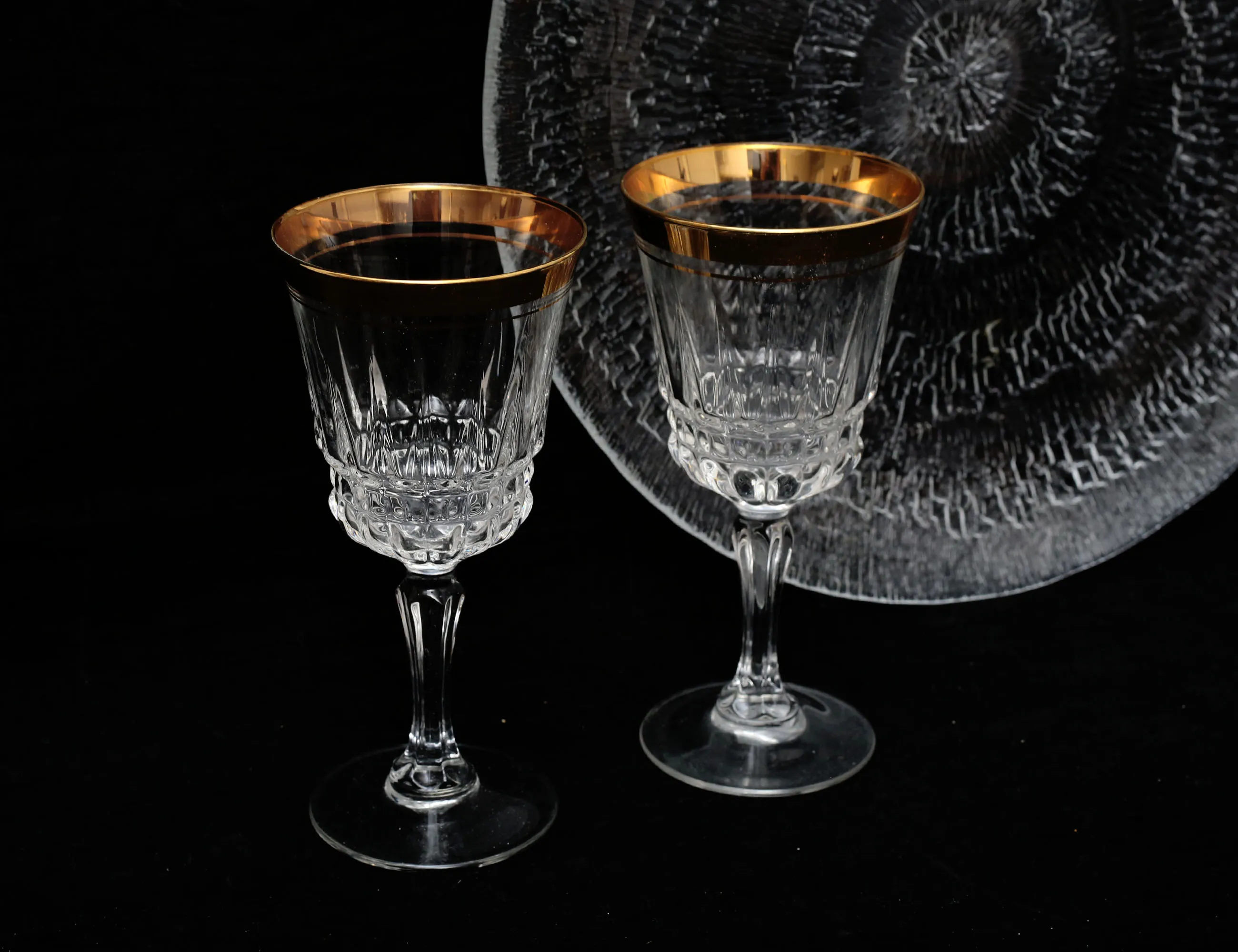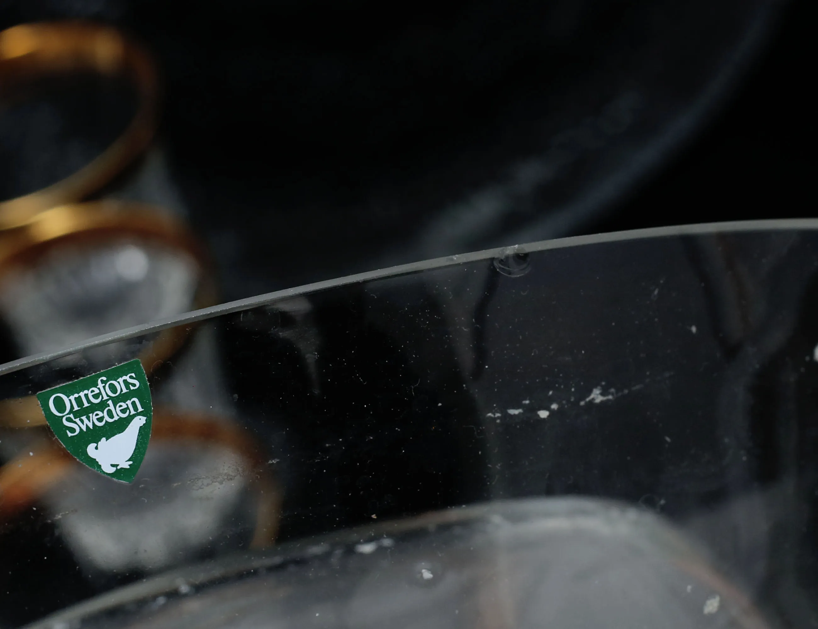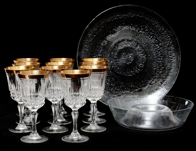 troligen Frankrike, förgylld kant, höjd 18, fat "Solaris" Tapio Wirkkala Iittala, diameter 35, räkskål Orrefors, diameter 25 (mindre nagg)