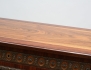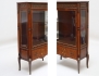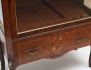 fanerat i olika träslag, intarsia, överdel med låda, nederdel med schatullinredning bakom framåtöppnat dörrblad, två hyllplan i glas, gjutna ornament och beslag i mässing, höjd 153, bredd 88, djup 38