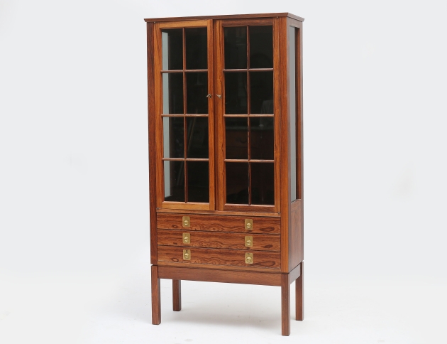 Torbjörn Afdal Bruksbo Norge, jakaranda, glasade spröjsade dörrar, tre hyllplan i glas, tre lådor med beslag i mässing, invändig belysning, citesintyg medföljer, höjd 150, bredd 72, djup 32