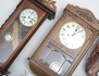 tidigt 1900-tal, en i valnöt med inläggningar av pärlemor, en valnöt med urtavla i emalj och mässing, en i ek med skuren dekor, höjd 59, 60, 85