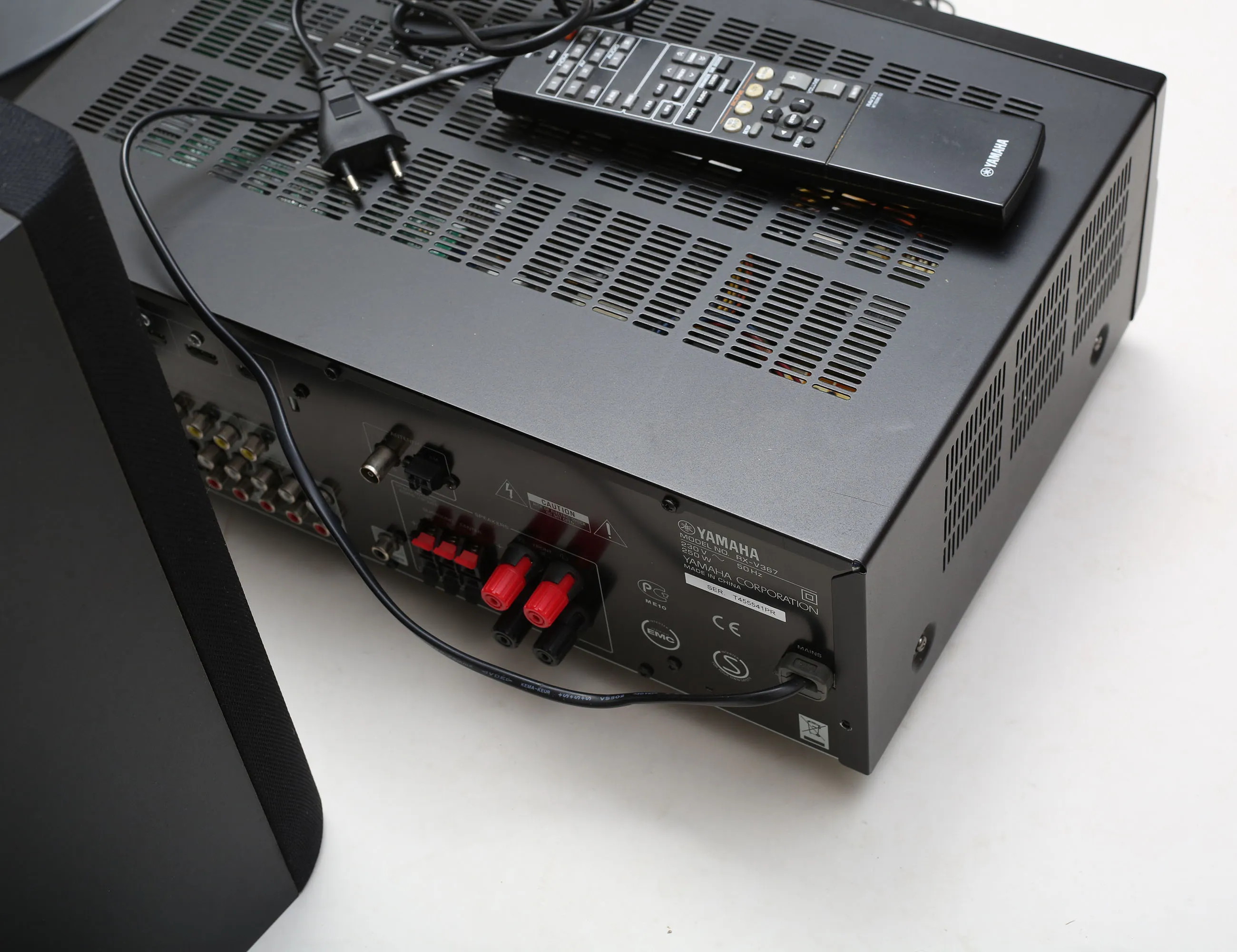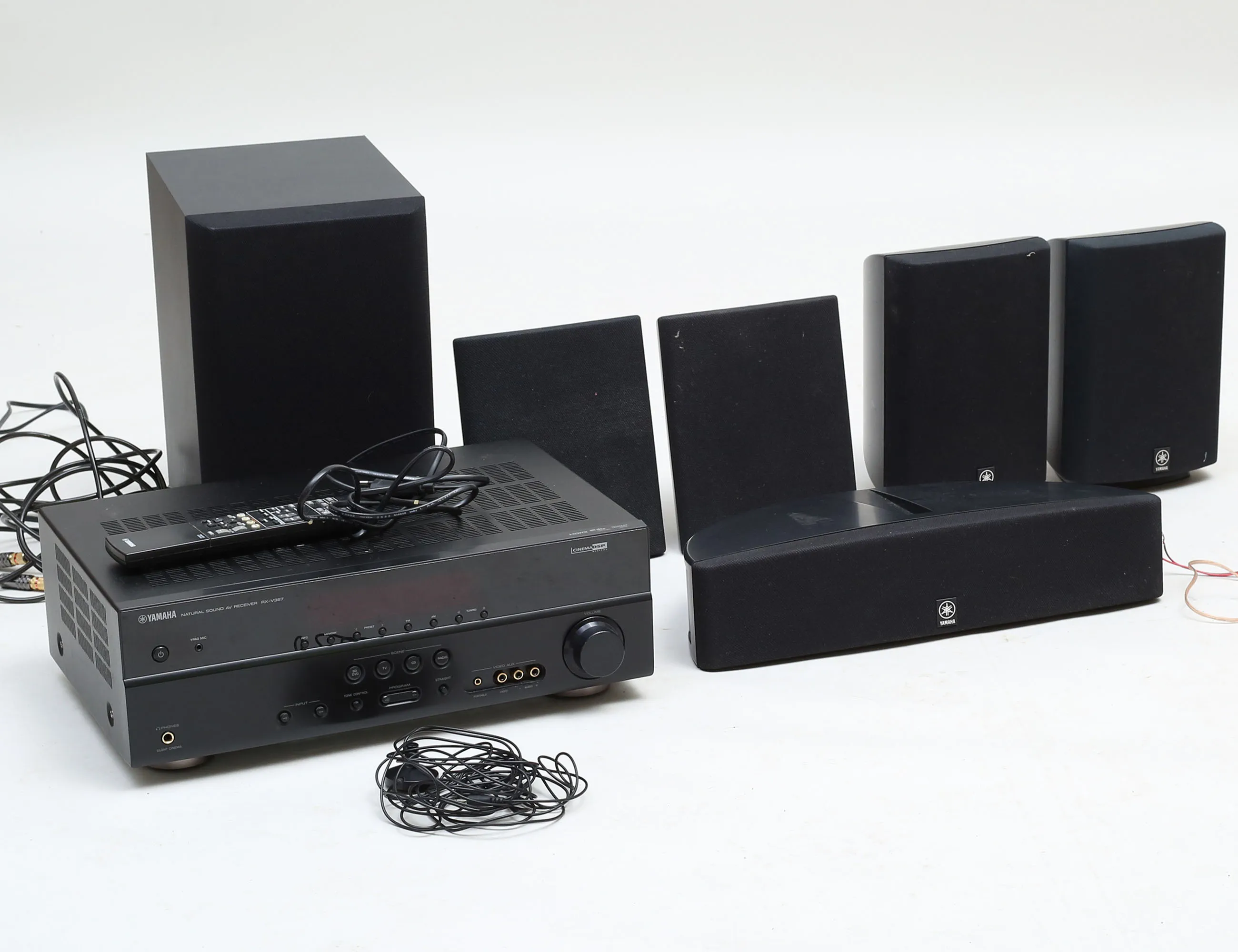 receiver RX-V367 5,1 1080P växel, högtalare Yamaha front, 2 surround, 1 center samt 1 subwoofer, högtalarsladdar, diverse kablar m.m., receiver lyser vid inkoppling i övrigt ej funktionstestad