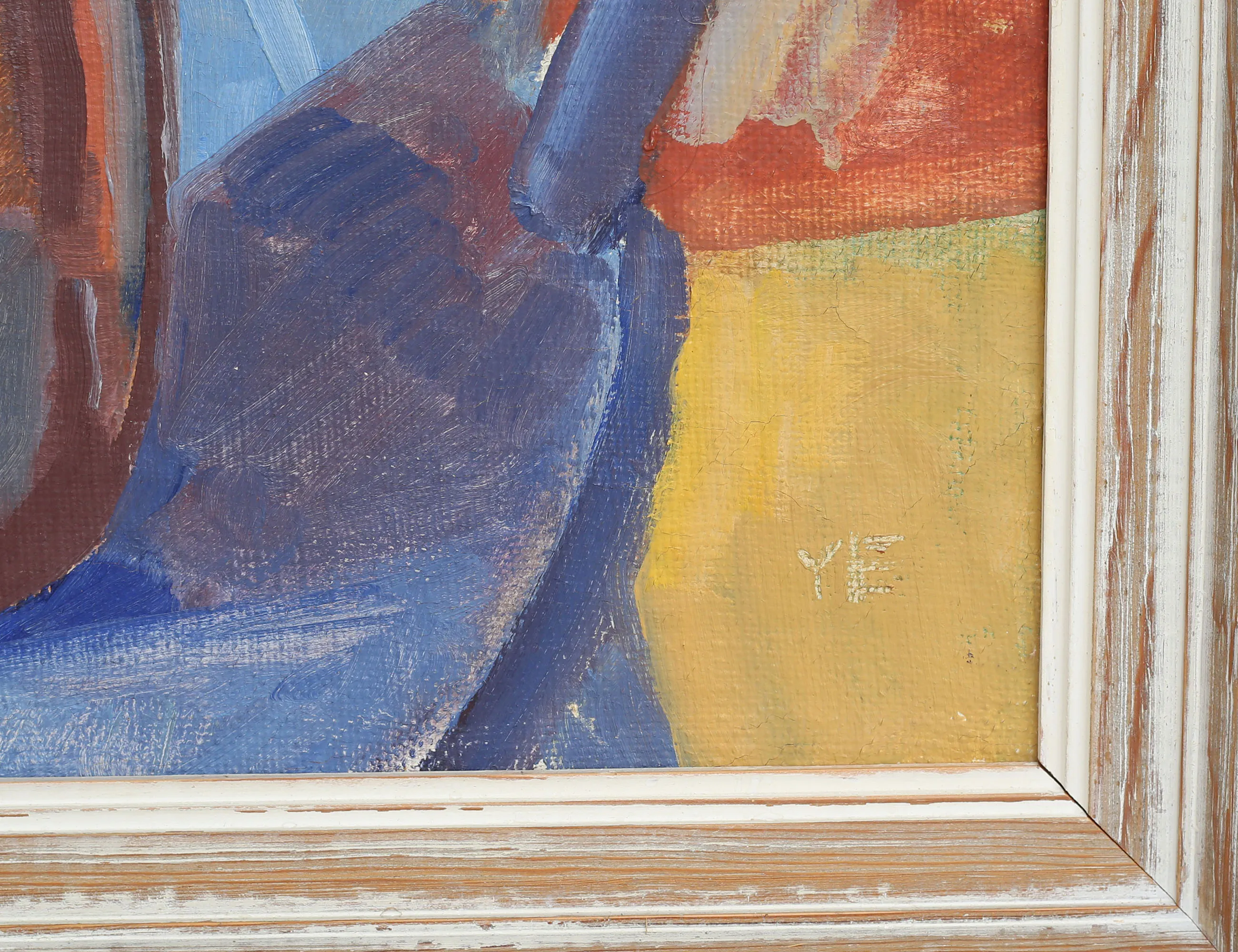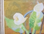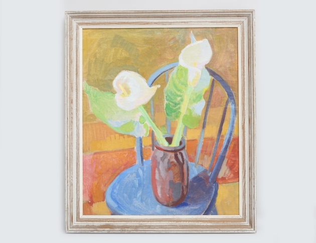 oljemålning på duk, stilleben med kalla på blå stol, monogramsignerad, proveniens: Yngve Ekströms kvarlåtenskap
