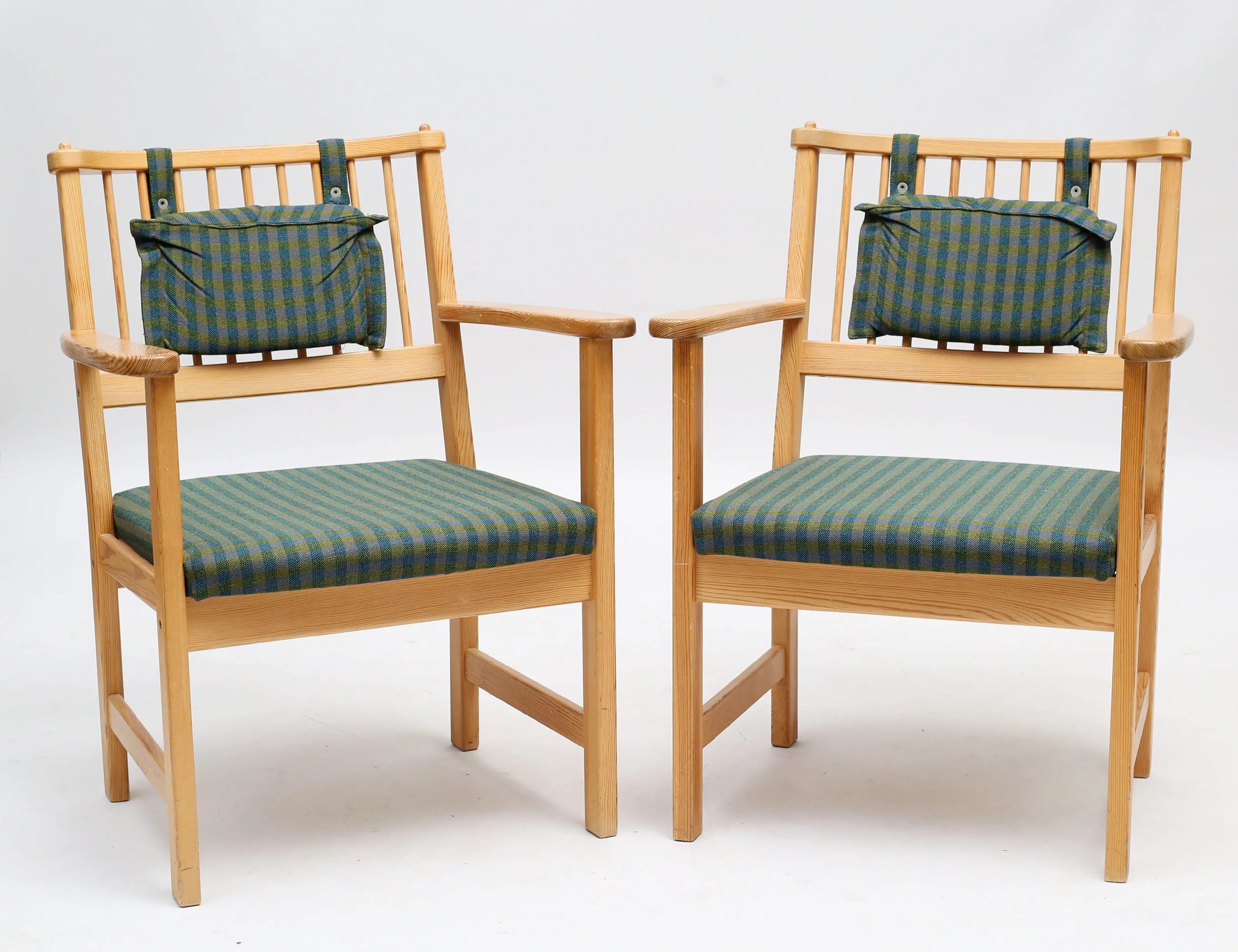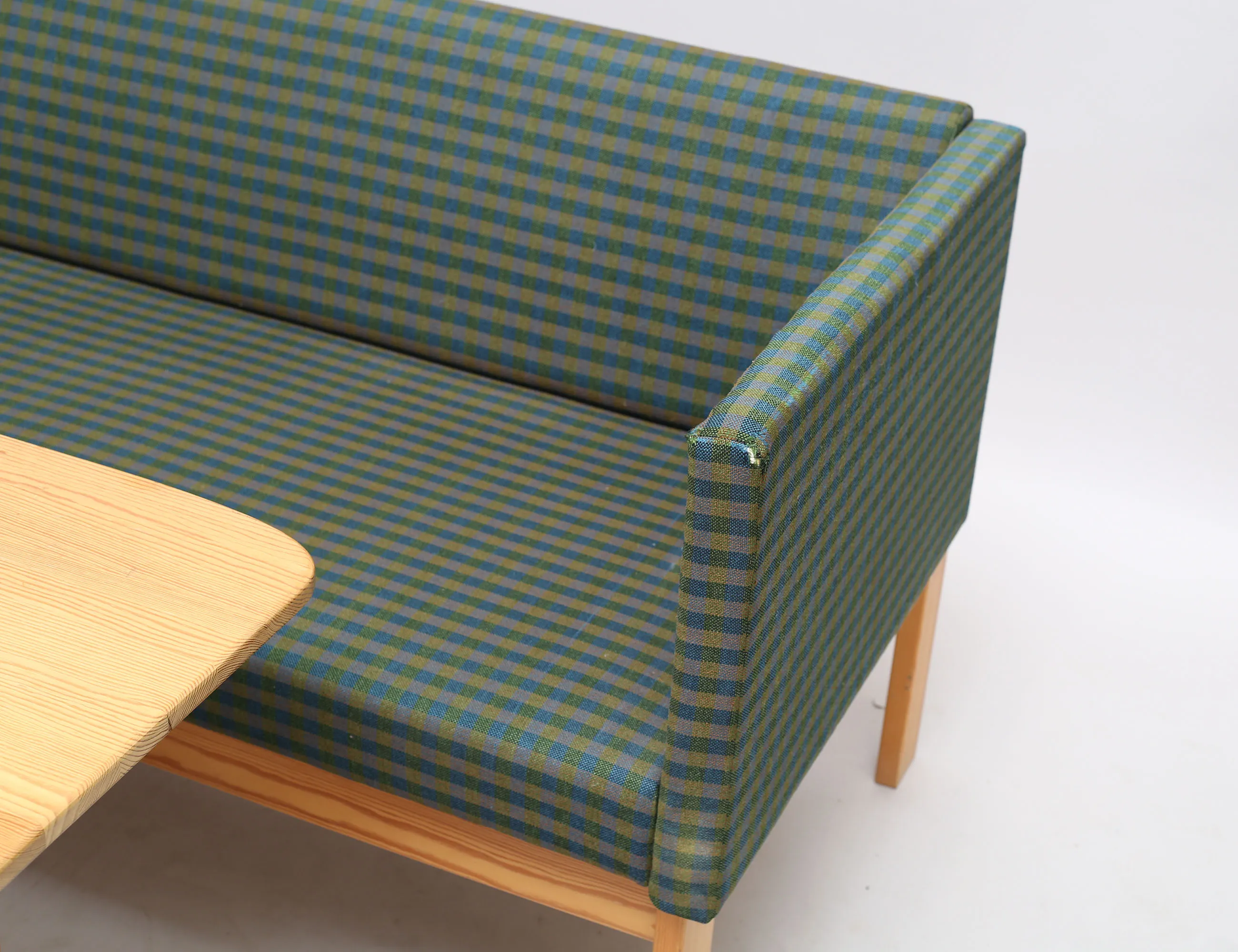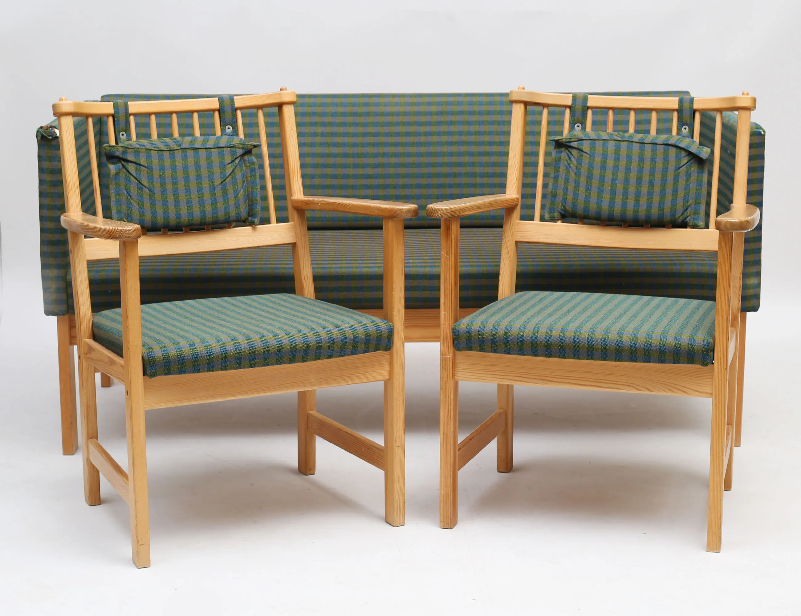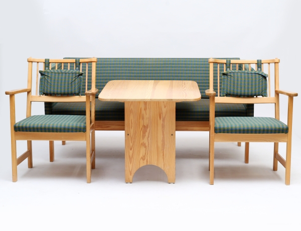 soffa, 1 par karmstolar samt bord "Furubo", 1960/70-tal, modellen formgiven 1964, furu, lösa och fasta stoppade sitsar, brännstämpel, bredd 160 (soffans klädsel med skador - extra tyg medföljer) (4)