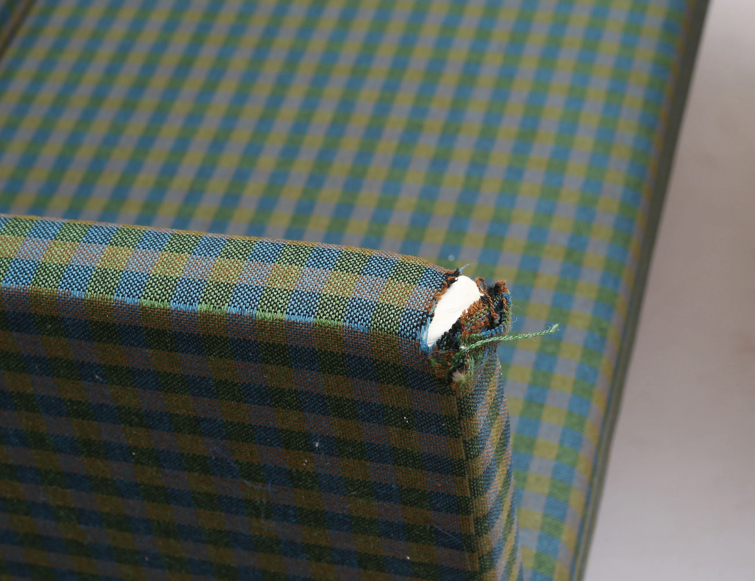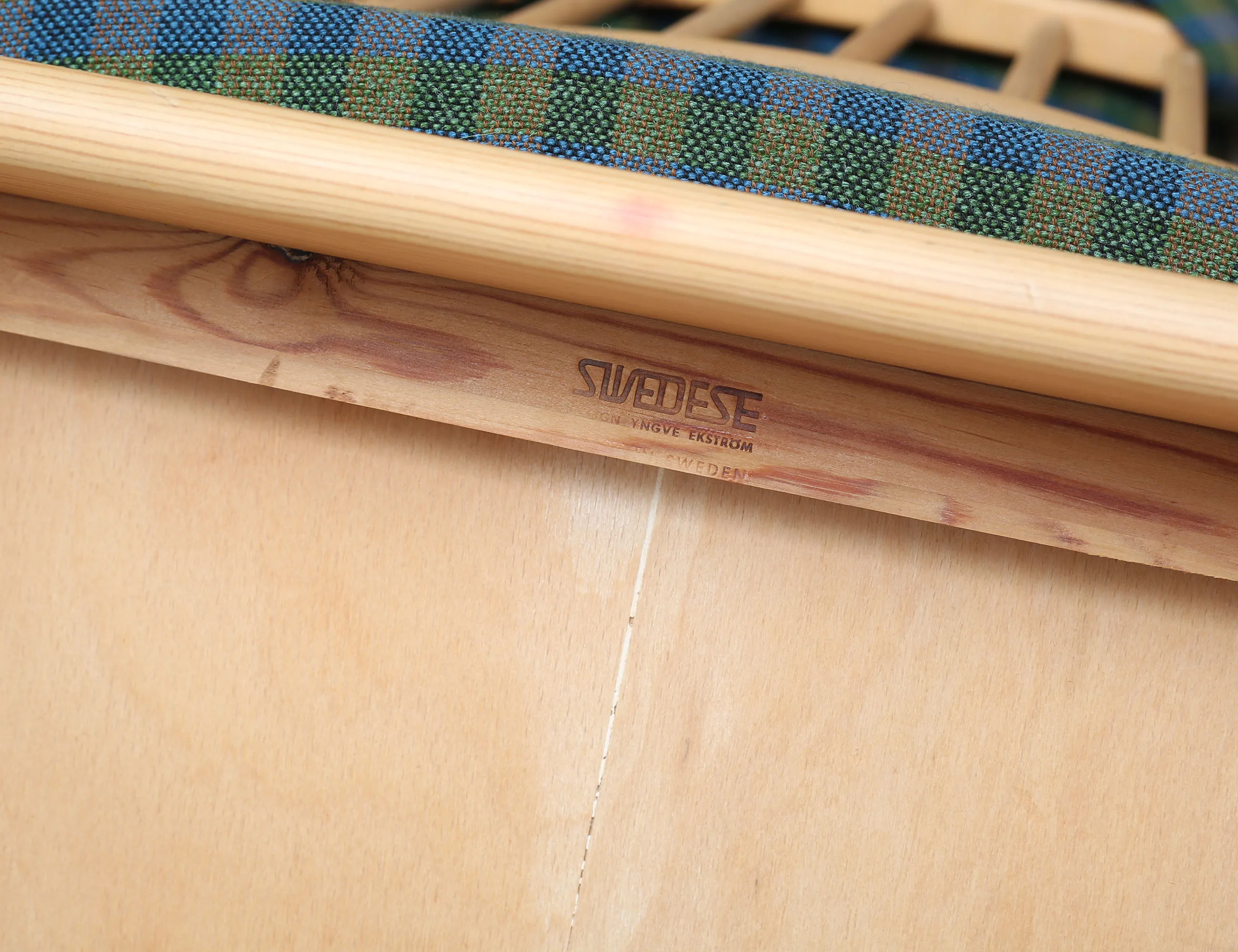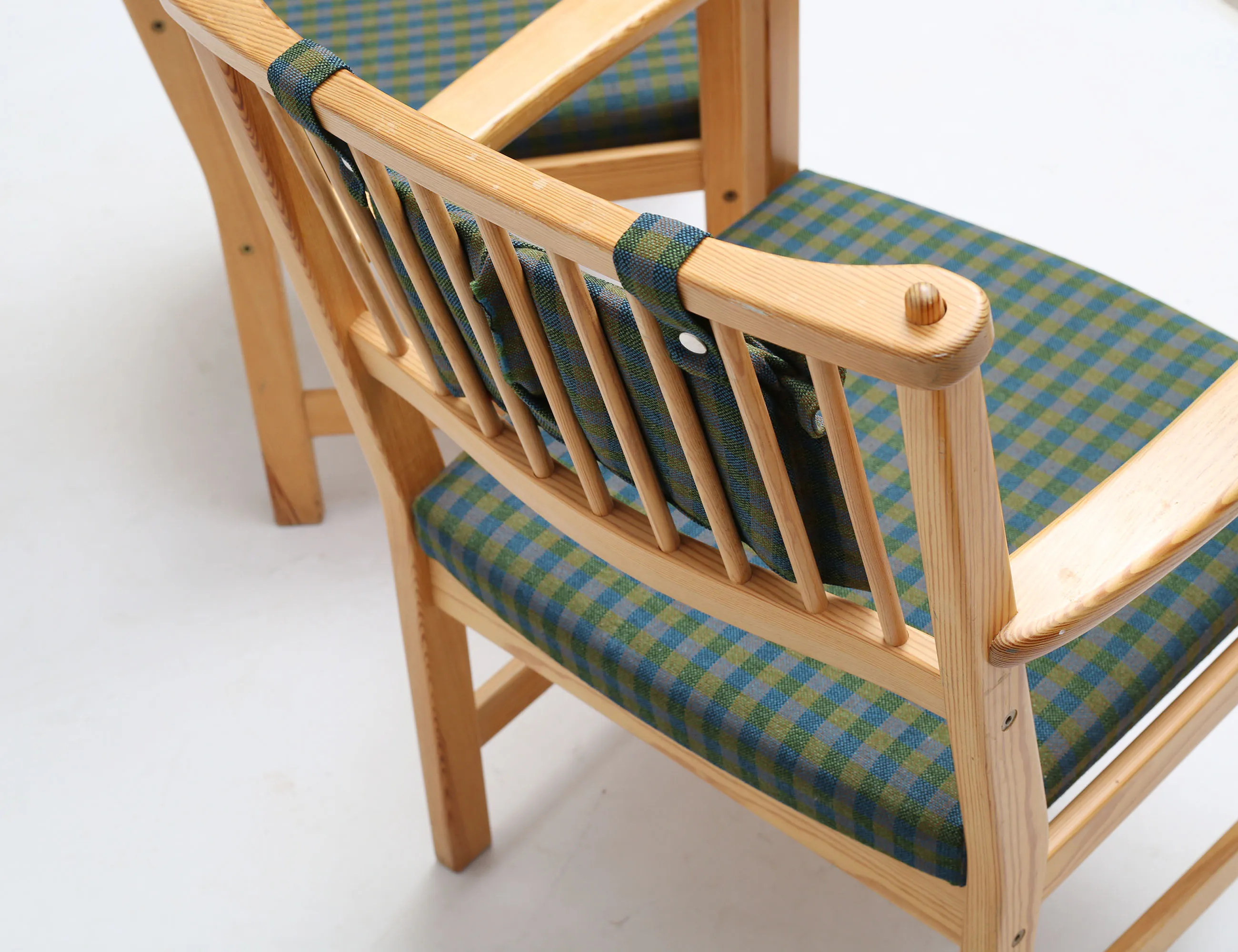 soffa, 1 par karmstolar samt bord "Furubo", 1960/70-tal, modellen formgiven 1964, furu, lösa och fasta stoppade sitsar, brännstämpel, bredd 160 (soffans klädsel med skador - extra tyg medföljer) (4)